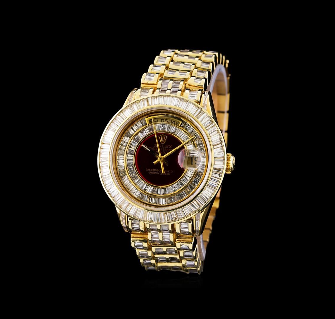 One Rolex President diamond DayDate men's watch featuring: Case: 18KT yellow gold. Bezel: 18KT yellow gold diamond set. Dial: Red color; diamond set dial. Features: Day window located at the 12 o'clock position; date window located at the 3 o'clock position. Bracelet: Custom 18KT yellow gold diamond set.
