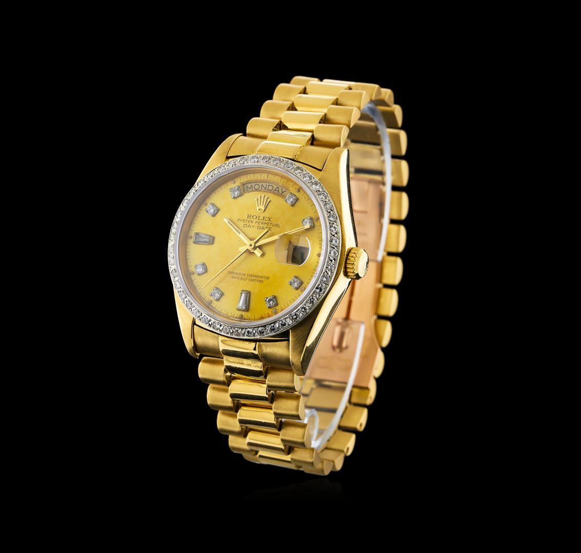One gents, Rolex DayDate Model the President wristwatch electronically tested 18KT yellow gold, Swiss Hallmarked Case: 36mm oyster, Crown: twin lock with Rolex hallmarked logo, non-factory Custom Bezel: diamond set, non-factory Custom Crystal: synthetic sapphire cyclops lens. Circa: 1981.Movement: superlative chronometer, Rolex signed Dial: Champagne color, with baton hands, & diamond markers, Calendar: single-quick set, Rolex President Bracelet: 18KT yellow gold, bright polish and satin finish, Condition: G-5 Fine. Seven and one half inch length. Swiss hallmarked Rolex concealed deployment clasp, with logo Containing: Forty-Four prong set round brilliant cut diamonds, measuring 1.70mm in diameter, approximate total weight of 44 Stones = 0.88ct. Set & graded in the custom bezel. Clarity: SI-1 Average. Color: H. Total Weight of Diamonds 0.88ct. Total Weight of Watch 124.07gm. AIG Appraised at $22,000.00.