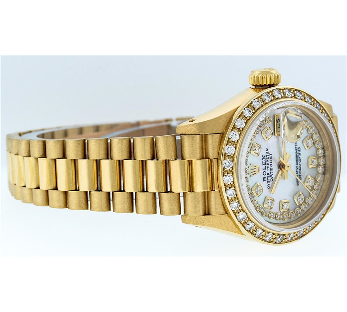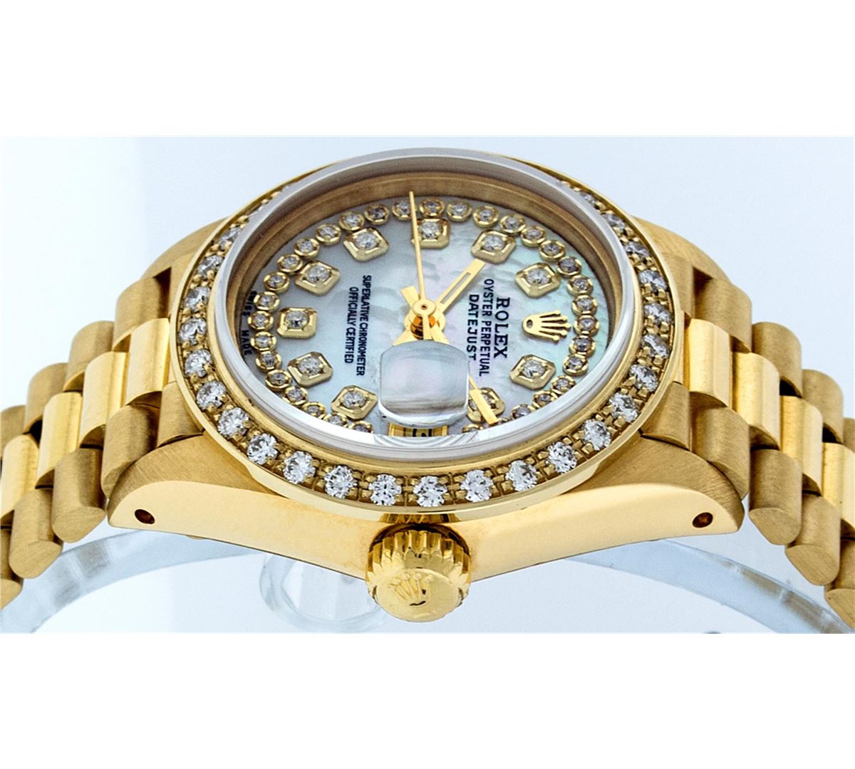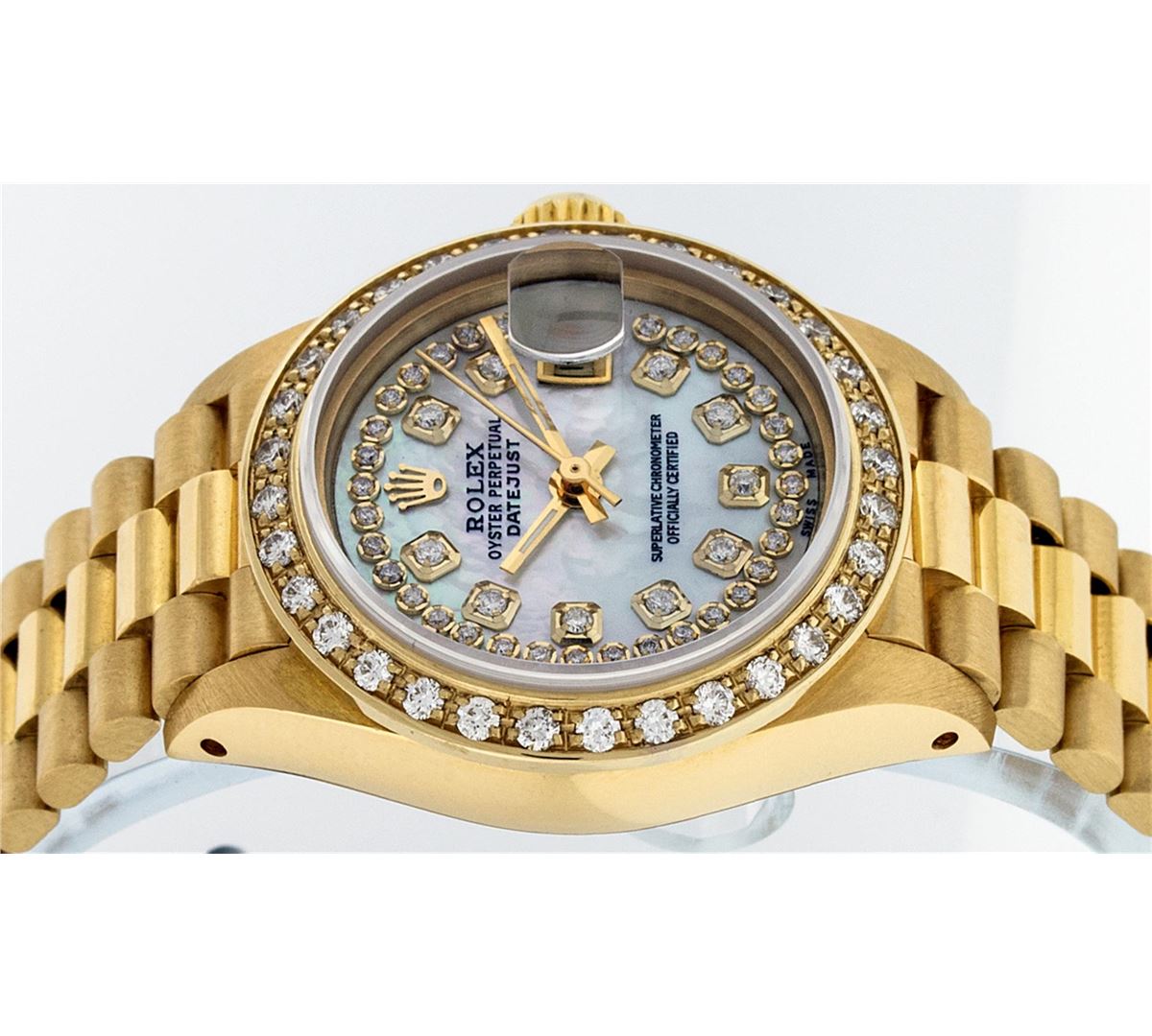 One Ladies Rolex 18K Yellow Gold President Polished, Serviced & Electronically Tested, 18K Yellow Gold Case: 26mm, 18K Yellow Gold Crown, Custom Bezel: 18K Yellow Gold Bead Set Diamond Bezel, Diamond Count: 32 Diamonds Total Weight .70 Carat, Clarity: SI-VS, Color: G to H. Custom Crystal: Synthetic Sapphire Cyclops Lens. Movement: Automatic Winding Movement Caliber 2030. Custom Dial: Mother Of Pearl With String Diamond Dial, Color: G to H, Diamond Count: 43 Diamonds In Dial, Clarity: SI-VS. Date Window: 3 O'Clock Position, Model: Datejust. Condition: G-6 Extra Fine The Watch Is In Very Good Condition Free Of All Scratches And Dents. . Bracelet: 18K Yellow Gold President Band, Bright & Satin Polish. 6.0 Inch Length, Standard President Clasp (Hidden Clasp), With Rolex Logo.