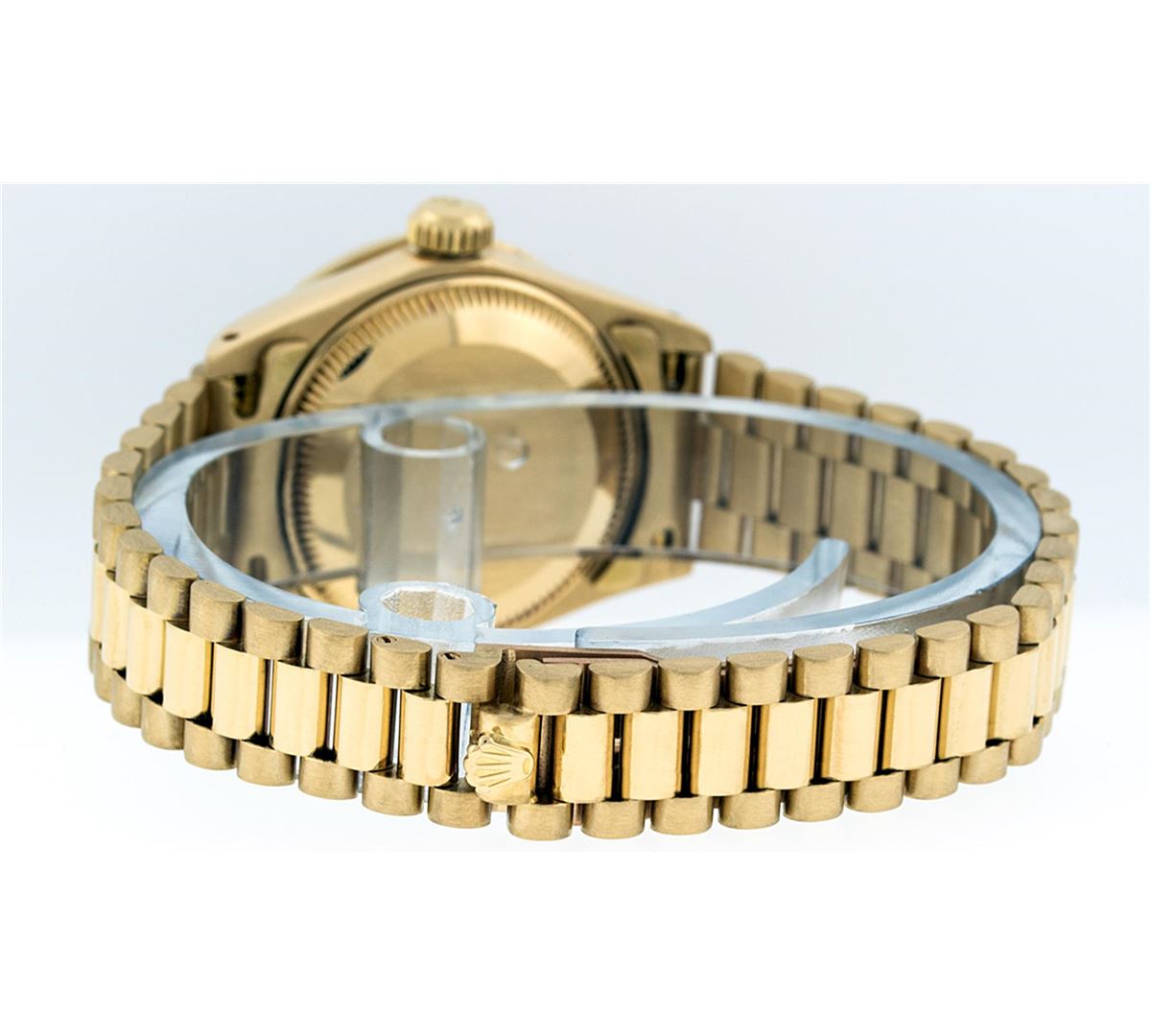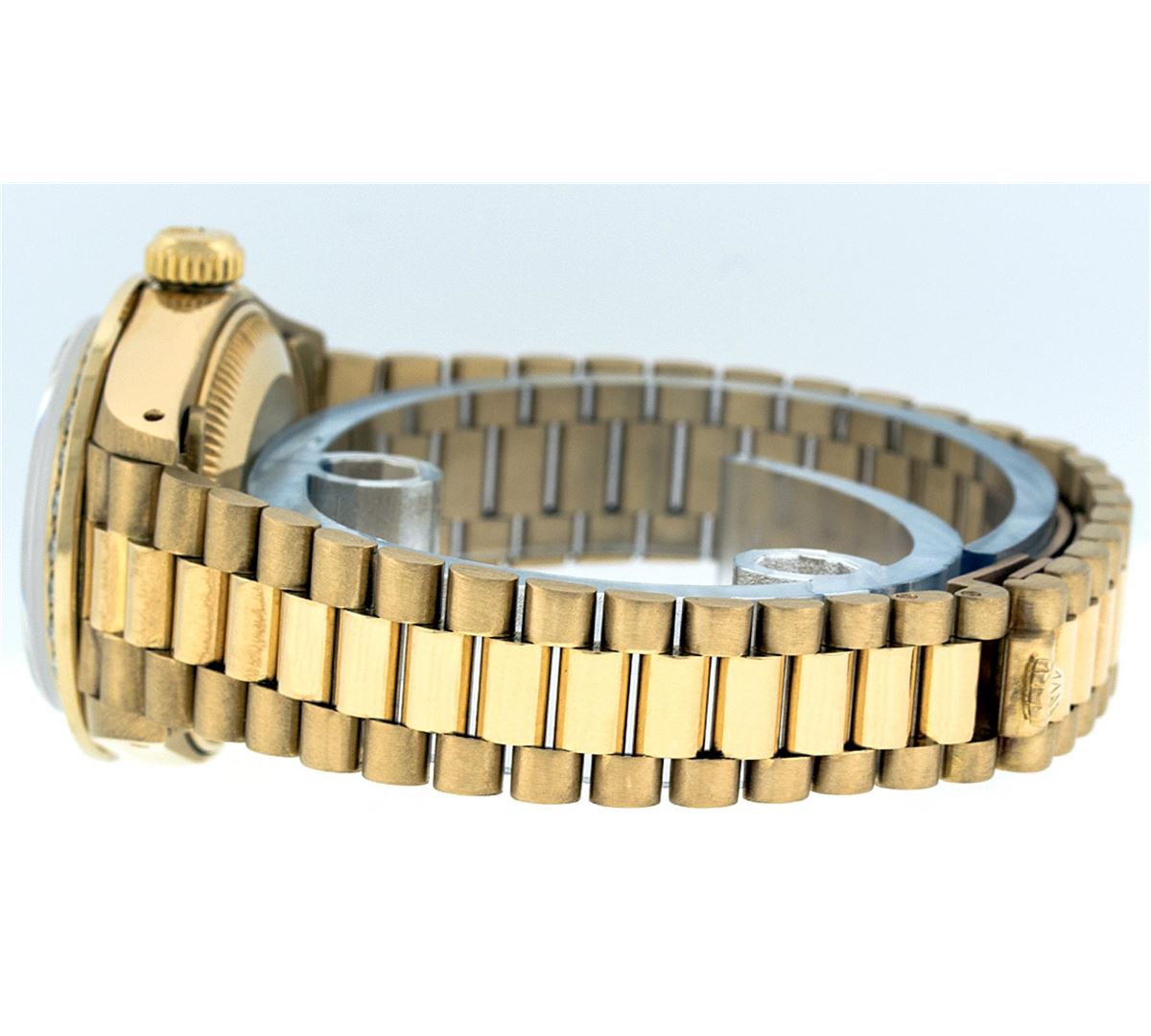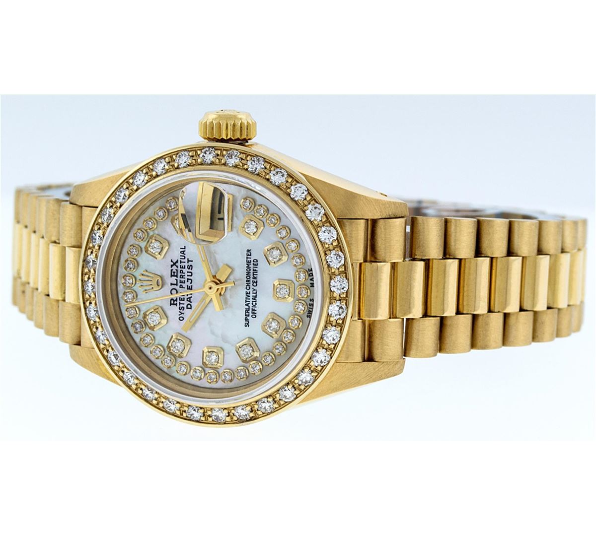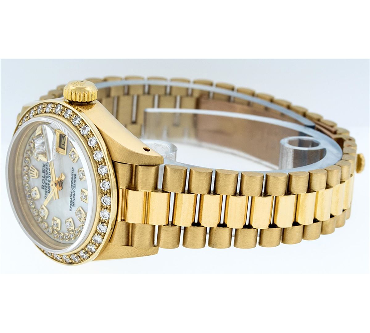 One Ladies Rolex 18K Yellow Gold President Polished, Serviced & Electronically Tested, 18K Yellow Gold Case: 26mm, 18K Yellow Gold Crown, Custom Bezel: 18K Yellow Gold Bead Set Diamond Bezel, Diamond Count: 32 Diamonds Total Weight .70 Carat, Clarity: SI-VS, Color: G to H. Custom Crystal: Synthetic Sapphire Cyclops Lens. Movement: Automatic Winding Movement Caliber 2030. Custom Dial: Mother Of Pearl With String Diamond Dial, Color: G to H, Diamond Count: 43 Diamonds In Dial, Clarity: SI-VS. Date Window: 3 O'Clock Position, Model: Datejust. Condition: G-6 Extra Fine The Watch Is In Very Good Condition Free Of All Scratches And Dents. . Bracelet: 18K Yellow Gold President Band, Bright & Satin Polish. 6.0 Inch Length, Standard President Clasp (Hidden Clasp), With Rolex Logo.
