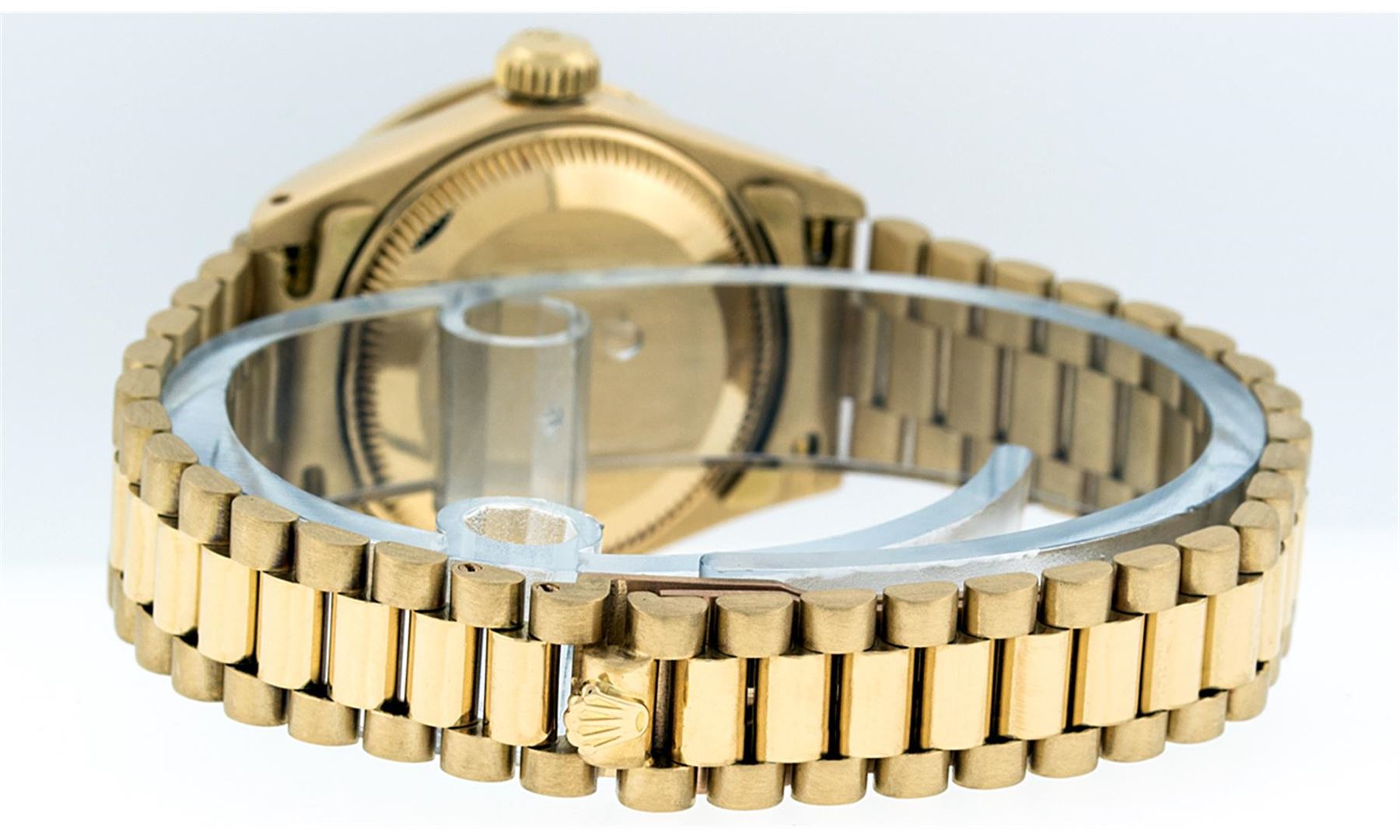 One Ladies Rolex 18K Yellow Gold President Polished, Serviced & Electronically Tested, 18K Yellow Gold Case: 26mm, 18K Yellow Gold Crown, Custom Bezel: 18K Yellow Gold Bead Set Diamond Bezel, Diamond Count: 32 Diamonds Total Weight .70 Carat, Clarity: SI-VS, Color: G to H. Custom Crystal: Synthetic Sapphire Cyclops Lens. Movement: Automatic Winding Movement Caliber 2030. Custom Dial: Mother Of Pearl With String Diamond Dial, Color: G to H, Diamond Count: 43 Diamonds In Dial, Clarity: SI-VS. Date Window: 3 O'Clock Position, Model: Datejust. Condition: G-6 Extra Fine The Watch Is In Very Good Condition Free Of All Scratches And Dents. . Bracelet: 18K Yellow Gold President Band, Bright & Satin Polish. 6.0 Inch Length, Standard President Clasp (Hidden Clasp), With Rolex Logo.