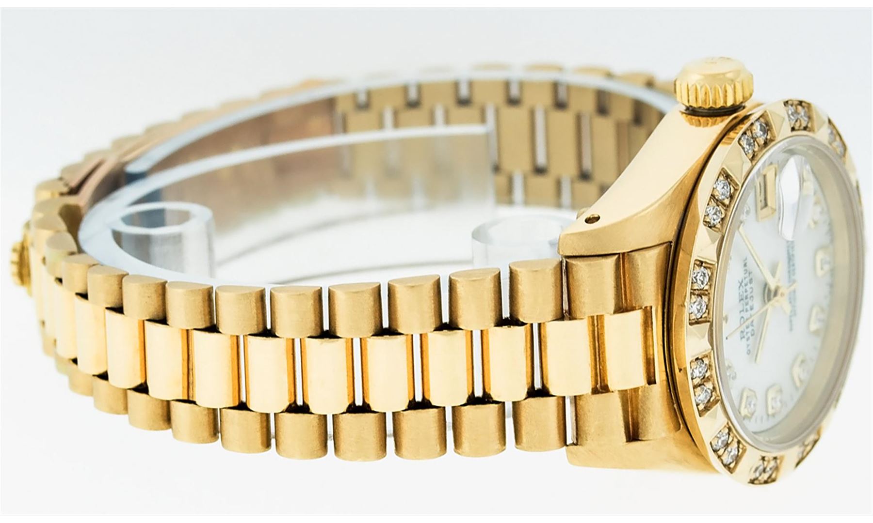 One Ladies 18K Rolex President Polished, Serviced & Electronically Tested, 18K Yellow Gold Case: 26mm, 18K Yellow Gold Crown, Custom Bezel: 18K Yellow Gold Pyramid Diamond Bezel, Diamond Count: 24 Diamonds In Dial. Total Weight .50 Carat, Clarity: SI-VS, Color: G to H. Custom Crystal: Synthetic Sapphire Cyclops Lens. Movement: Automatic Winding Movement Caliber 2030. Custom Dial: Mother Of Pearl Diamond Dial With Line Track, Diamond Count: 10 Diamonds In Dial, Clarity: SI-VS, Color: G To H. Date Window: 3 O'Clock Position, Model: Datejust President, Condition: G-6 Extra Fine The Watch Is In Very Good Condition Free Of All Scratches And Dents. Bracelet: 18K Yellow Gold President With Hidden Clasp, Bright & Satin Polish. 6.0 Inch Length, Standard President Clasp (Hidden Clasp), With Rolex Logo. Comes with 6 month warranty.