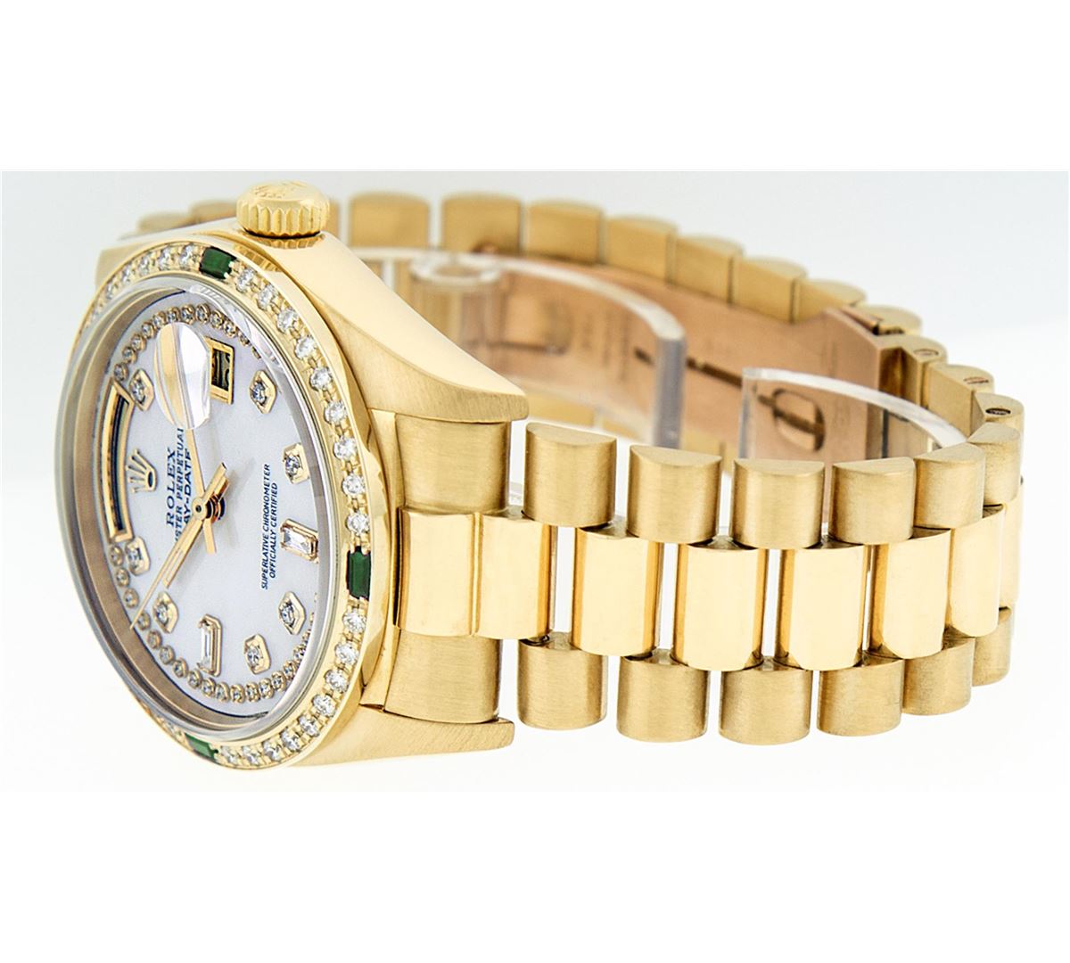 One Mens Rolex Day Date 18K Yellow Gold President Polished, Serviced & Electronically Tested, 18K Yellow Gold Case:36mm, 18K Yellow Gold Crown, Custom Bezel: 18K Yellow Gold Emerald Beadset Diamond Bezel, Diamond + Gem Count: 36 Diamonds + 4 Emeralds Total Weight 1.00 Carat, Clarity: SI-VS, Color: G to H. Custom Crystal: Synthetic Sapphire Cyclops Lens. Movement: Automatic Winding Movement Caliber 3055. Custom Dial: Mother Of Pearl String Diamond Dial With 2 Baguettes, (49 Diamond In Dial + 2 Baguette Diamonds In Dial) G To H In Color, Clarity: SI-VS. Date Window: 3 O'Clock Position Date Display, Day Window: 12 O'Clock Position Date Display. Quickset, Model: Day Date President. Condition: G-6 Extra Fine. Bracelet: 18K Yellow Gold President. Bright Polish. 7.0 Inch Length, Standard Hidden President Clasp President Band, With Rolex Logo.