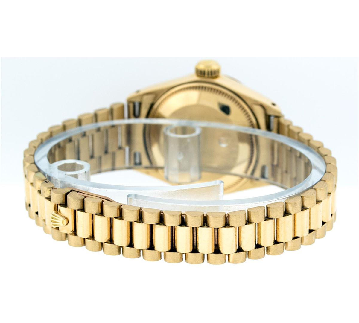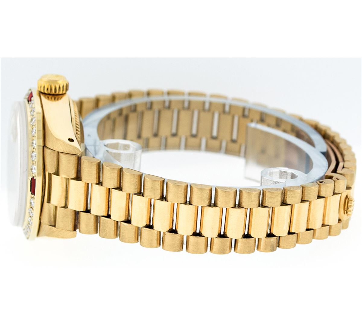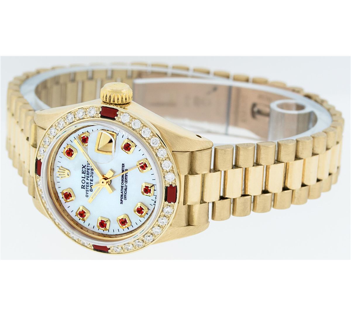 One Ladies 18K Rolex President Polished, Serviced & Electronically Tested, Yellow Gold Case: 26mm, 18K Yellow Gold Crown, Custom Bezel: 18K Yellow Gold Ruby BeadSet Diamond Bezel, Diamond + Stone Count: 28 Diamonds + 4 Rubies. Total Weight .70 Carat, Clarity: SI-VS, Color: G to H. Custom Crystal: Synthetic Sapphire Cyclops Lens. Movement: Automatic Winding Movement Caliber 2030. Custom Dial: Mother Of Pearl With Rubies, Stone Count: 10 Rubies In Dial. Date Window: 3 O'Clock Position, Model: Datejust, Condition: G-6 Extra Fine. Bracelet: 18K Yellow Gold President With Hidden Clasp, Bright & Satin Polish. 6.0 Inch Length, Standard President Clasp (Hidden Clasp), With Rolex Logo.