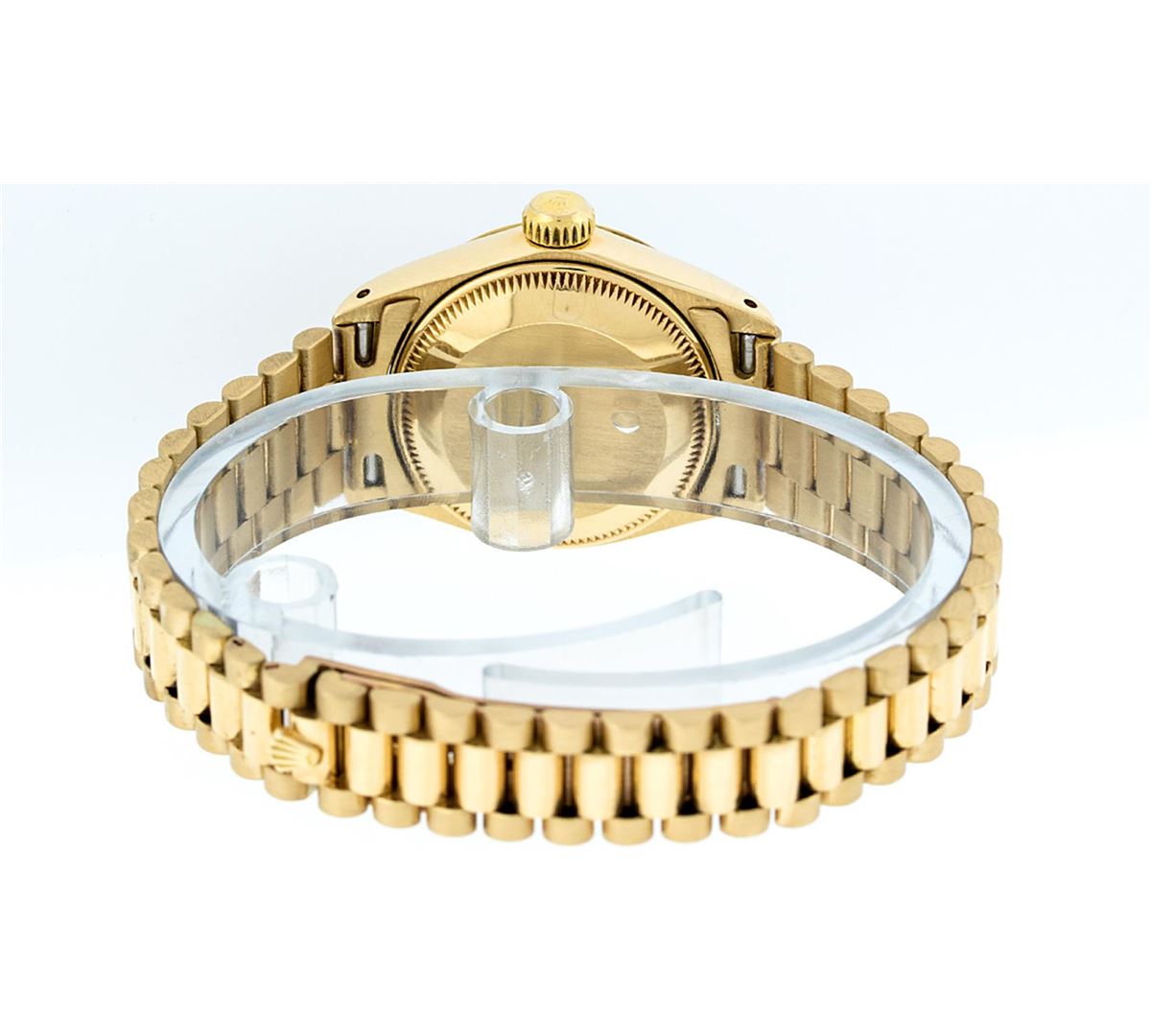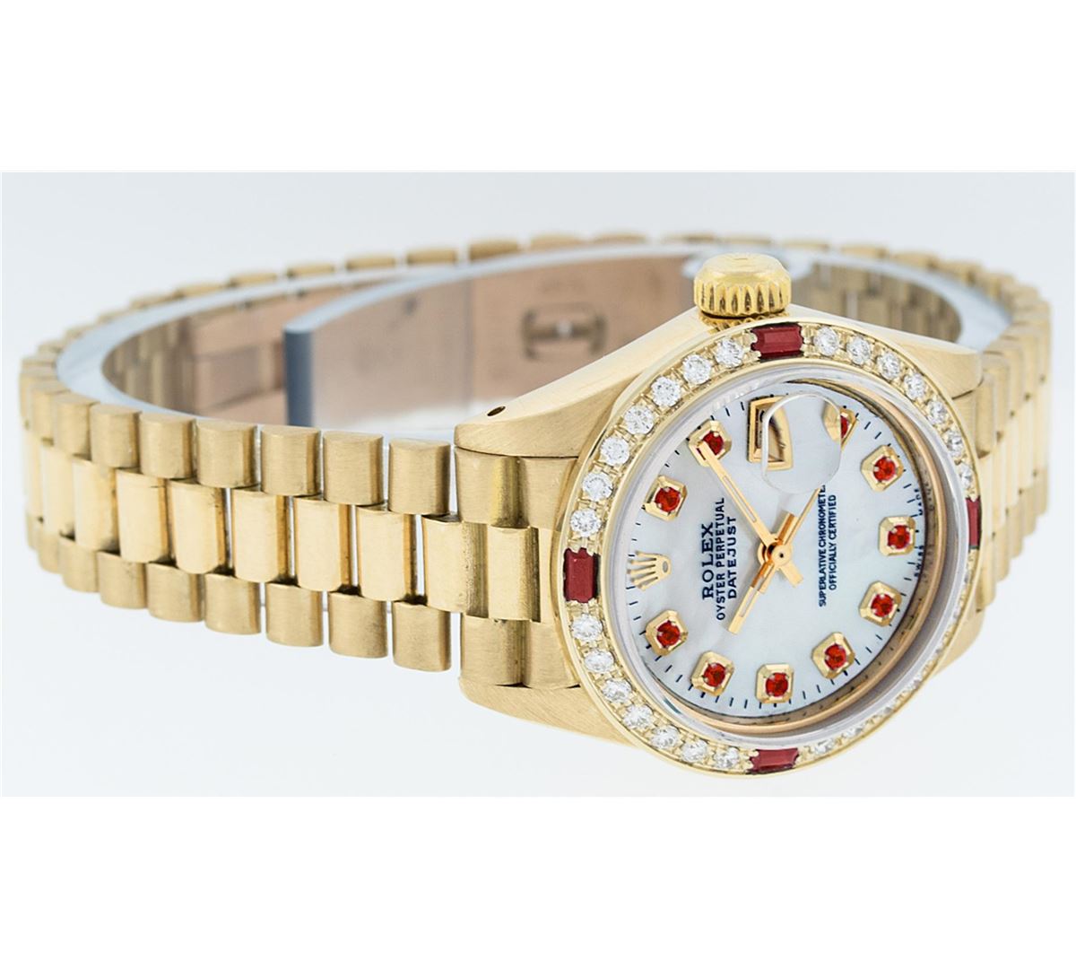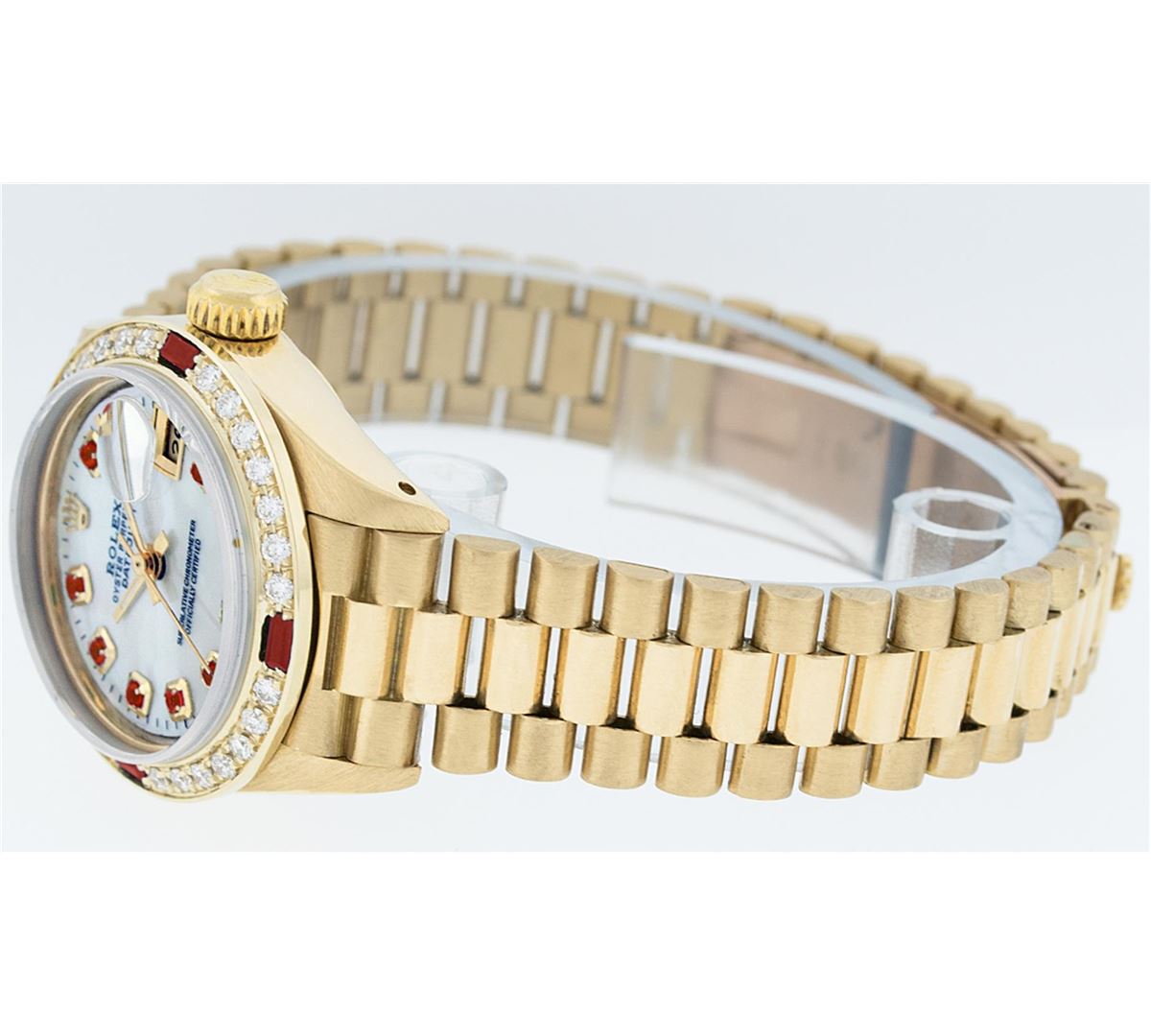 One Ladies 18K Rolex President Polished, Serviced & Electronically Tested, Yellow Gold Case: 26mm, 18K Yellow Gold Crown, Custom Bezel: 18K Yellow Gold Ruby BeadSet Diamond Bezel, Diamond + Stone Count: 28 Diamonds + 4 Rubies. Total Weight .70 Carat, Clarity: SI-VS, Color: G to H. Custom Crystal: Synthetic Sapphire Cyclops Lens. Movement: Automatic Winding Movement Caliber 2030. Custom Dial: Mother Of Pearl With Rubies, Stone Count: 10 Rubies In Dial. Date Window: 3 O'Clock Position, Model: Datejust, Condition: G-6 Extra Fine. Bracelet: 18K Yellow Gold President With Hidden Clasp, Bright & Satin Polish. 6.0 Inch Length, Standard President Clasp (Hidden Clasp), With Rolex Logo.