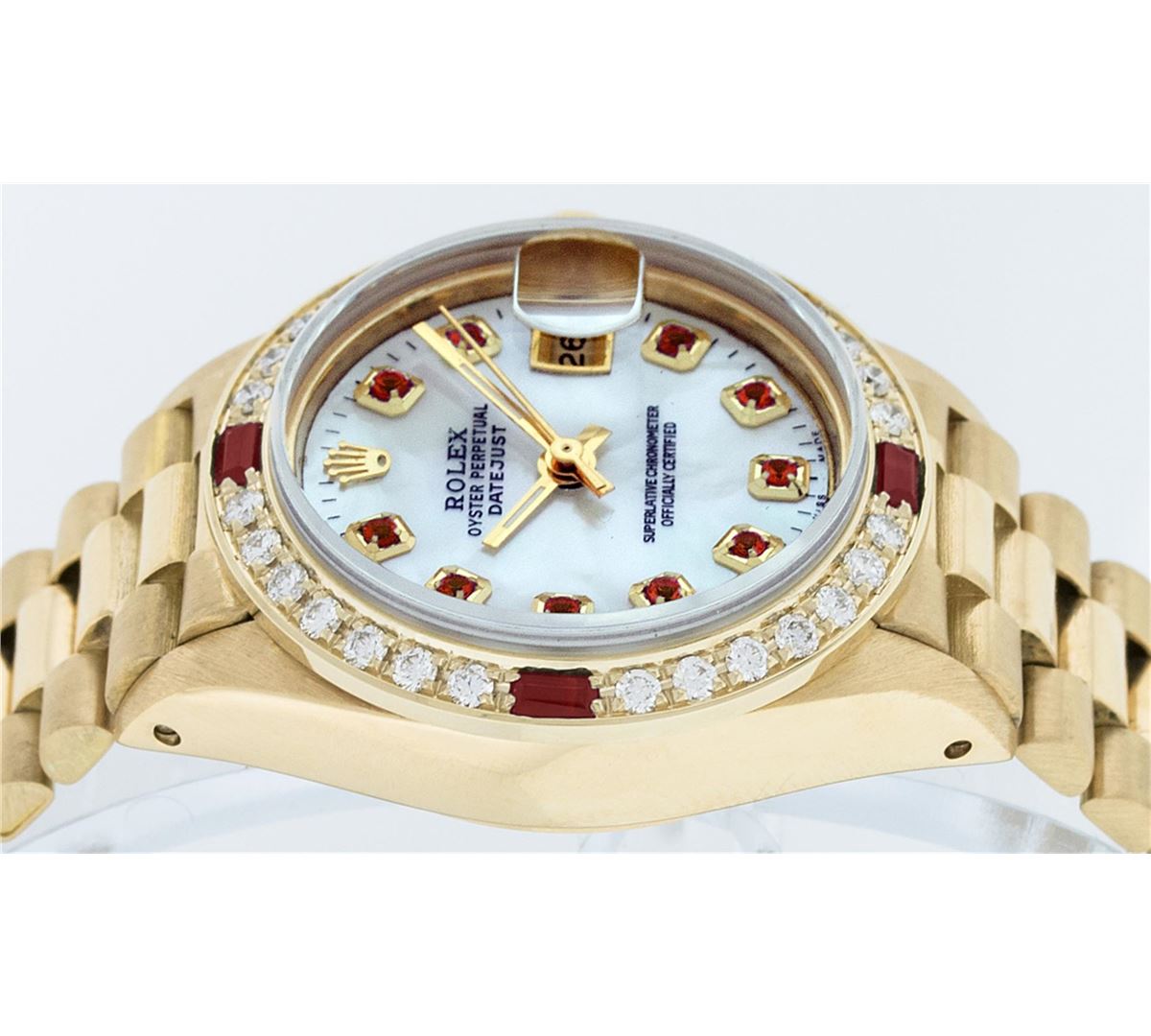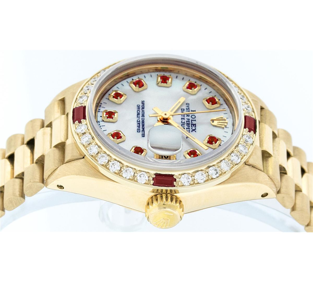 One Ladies 18K Rolex President Polished, Serviced & Electronically Tested, Yellow Gold Case: 26mm, 18K Yellow Gold Crown, Custom Bezel: 18K Yellow Gold Ruby BeadSet Diamond Bezel, Diamond + Stone Count: 28 Diamonds + 4 Rubies. Total Weight .70 Carat, Clarity: SI-VS, Color: G to H. Custom Crystal: Synthetic Sapphire Cyclops Lens. Movement: Automatic Winding Movement Caliber 2030. Custom Dial: Mother Of Pearl With Rubies, Stone Count: 10 Rubies In Dial. Date Window: 3 O'Clock Position, Model: Datejust, Condition: G-6 Extra Fine. Bracelet: 18K Yellow Gold President With Hidden Clasp, Bright & Satin Polish. 6.0 Inch Length, Standard President Clasp (Hidden Clasp), With Rolex Logo.