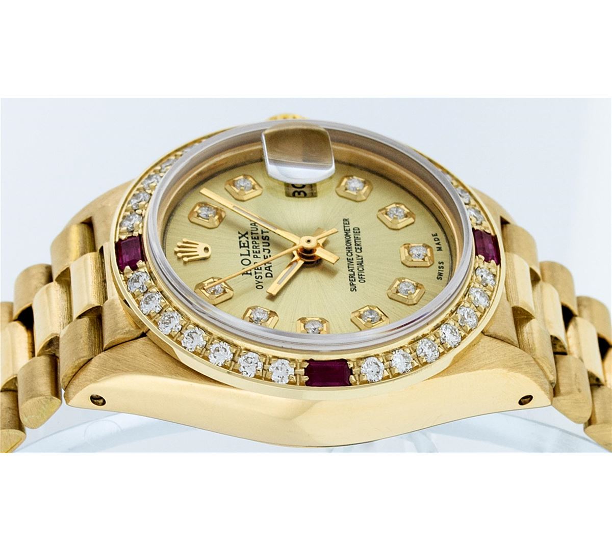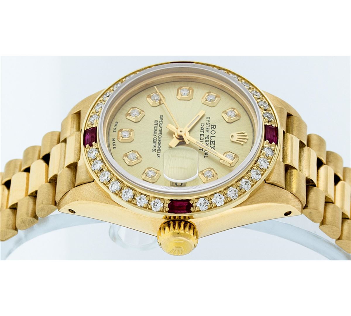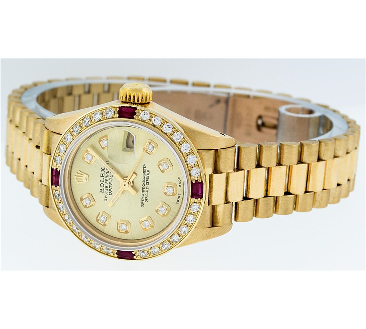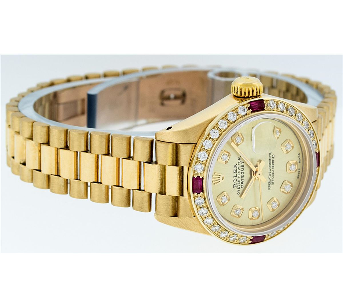 One Ladies 18K Rolex President Polished, Serviced & Electronically Tested, 18K Yellow Gold Case: 26mm, 18K Yellow Gold Crown, Custom Bezel: 18K Yellow Gold Ruby BeadSet Diamond Bezel, Diamond + Stone Count: 28 Diamonds + 4 Rubies. Total Weight .70 Carat, Clarity: SI-VS, Color: G to H. Custom Crystal: Synthetic Sapphire Cyclops Lens. Movement: Automatic Winding Movement Caliber 2030. Custom Dial: Champagne Diamond Dial, Diamond Count: 10 Diamonds In Dial. Date Window: 3 O'Clock Position, Model: Datejust President, Condition: G-6 Extra Fine The Watch Is In Very Good Condition Free Of All Scratches And Dents. . Bracelet: 18K Yellow Gold President With Hidden Clasp, Bright & Satin Polish. 6.0 Inch Length, Standard President Clasp (Hidden Clasp), With Rolex Logo.