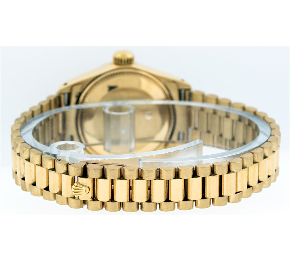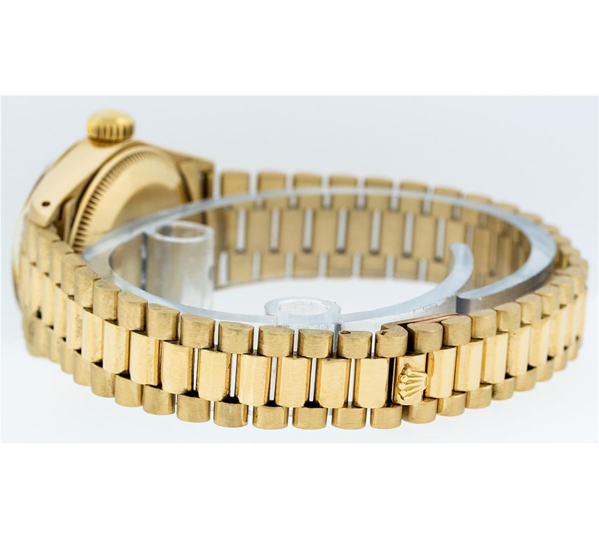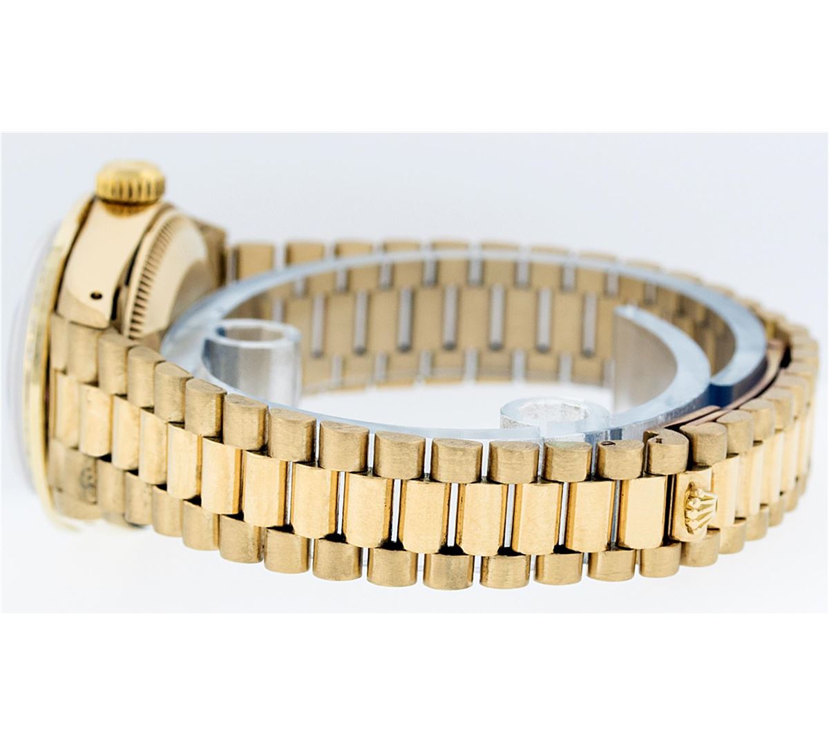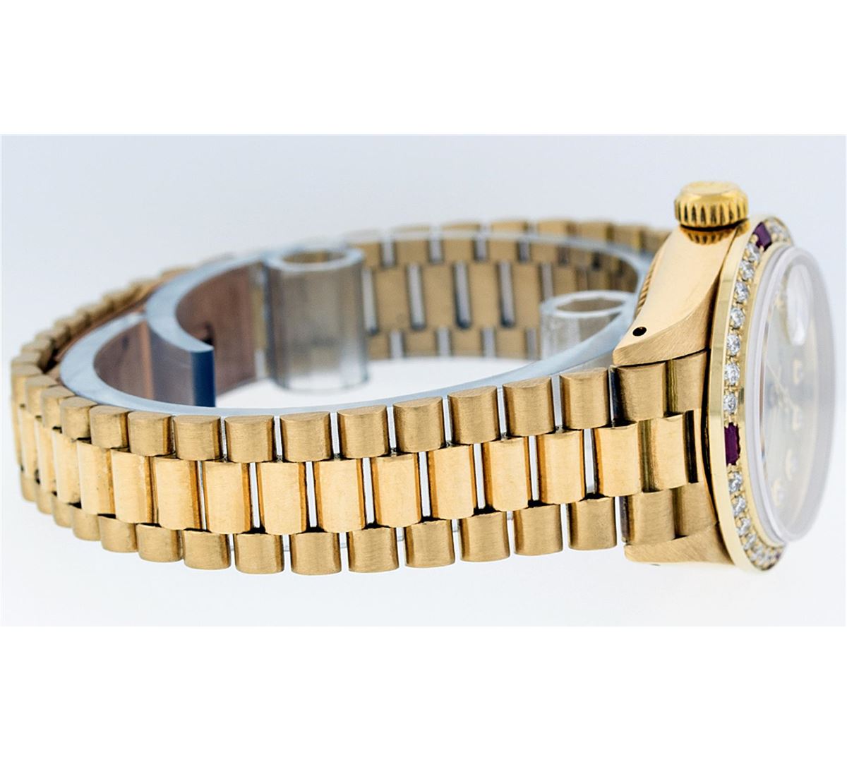 One Ladies 18K Rolex President Polished, Serviced & Electronically Tested, 18K Yellow Gold Case: 26mm, 18K Yellow Gold Crown, Custom Bezel: 18K Yellow Gold Ruby BeadSet Diamond Bezel, Diamond + Stone Count: 28 Diamonds + 4 Rubies. Total Weight .70 Carat, Clarity: SI-VS, Color: G to H. Custom Crystal: Synthetic Sapphire Cyclops Lens. Movement: Automatic Winding Movement Caliber 2030. Custom Dial: Champagne Diamond Dial, Diamond Count: 10 Diamonds In Dial. Date Window: 3 O'Clock Position, Model: Datejust President, Condition: G-6 Extra Fine The Watch Is In Very Good Condition Free Of All Scratches And Dents. . Bracelet: 18K Yellow Gold President With Hidden Clasp, Bright & Satin Polish. 6.0 Inch Length, Standard President Clasp (Hidden Clasp), With Rolex Logo.