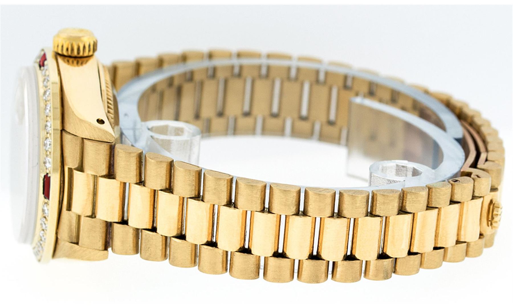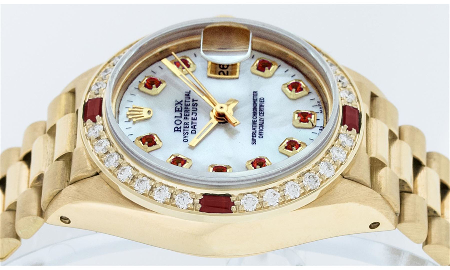 One Ladies 18K Rolex President Polished, Serviced & Electronically Tested, Yellow Gold Case: 26mm, 18K Yellow Gold Crown, Custom Bezel: 18K Yellow Gold Ruby BeadSet Diamond Bezel, Diamond + Stone Count: 28 Diamonds + 4 Rubies. Total Weight .70 Carat, Clarity: SI-VS, Color: G to H. Custom Crystal: Synthetic Sapphire Cyclops Lens. Movement: Automatic Winding Movement Caliber 2030. Custom Dial: Mother Of Pearl With Rubies, Stone Count: 10 Rubies In Dial. Date Window: 3 O'Clock Position, Model: Datejust, Condition: G-6 Extra Fine. Bracelet: 18K Yellow Gold President With Hidden Clasp, Bright & Satin Polish. 6.0 Inch Length, Standard President Clasp (Hidden Clasp), With Rolex Logo.