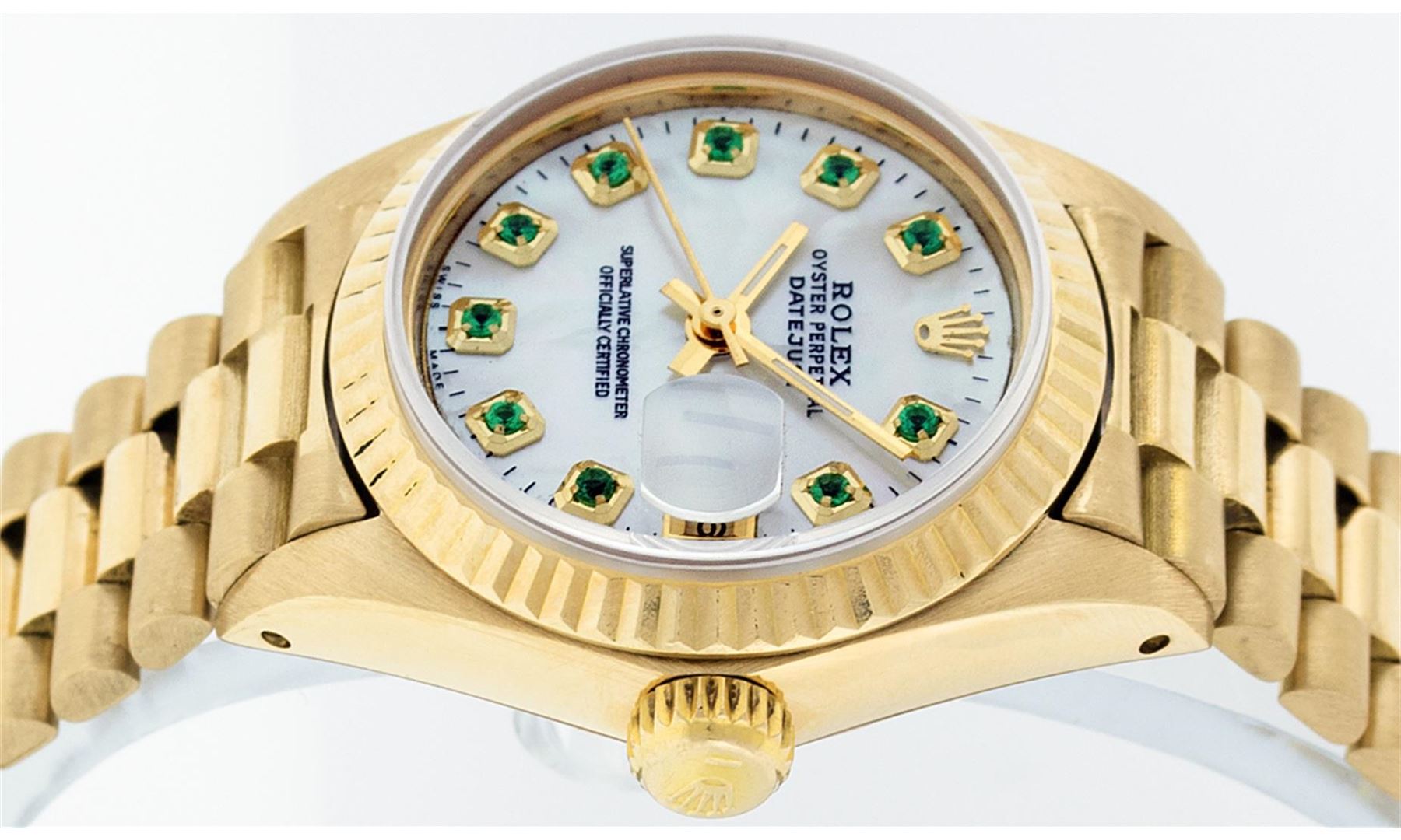 One Ladies 18K Rolex President Polished, Serviced & Electronically Tested, Yellow Gold Case: 26mm, 18K Yellow Gold Crown, Bezel: 18K Yellow Gold Fluted Bezel. Custom Crystal: Synthetic Acrylic Cyclops Lens. Movement: Automatic Winding Movement Caliber 2135. Custom Dial: Mother Of Pearl With Emeralds, Stone Count: 10 Emeralds In Dial. Date Window: 3 O'Clock Position, Quickset, Model: Quickset President Datejust, Condition: G-6 Extra Fine. Bracelet: 18K Yellow Gold President With Hidden Clasp, Bright & Satin Polish. 6.0 Inch Length, Standard President Clasp (Hidden Clasp), With Rolex Logo. Comes with 6 month warranty.