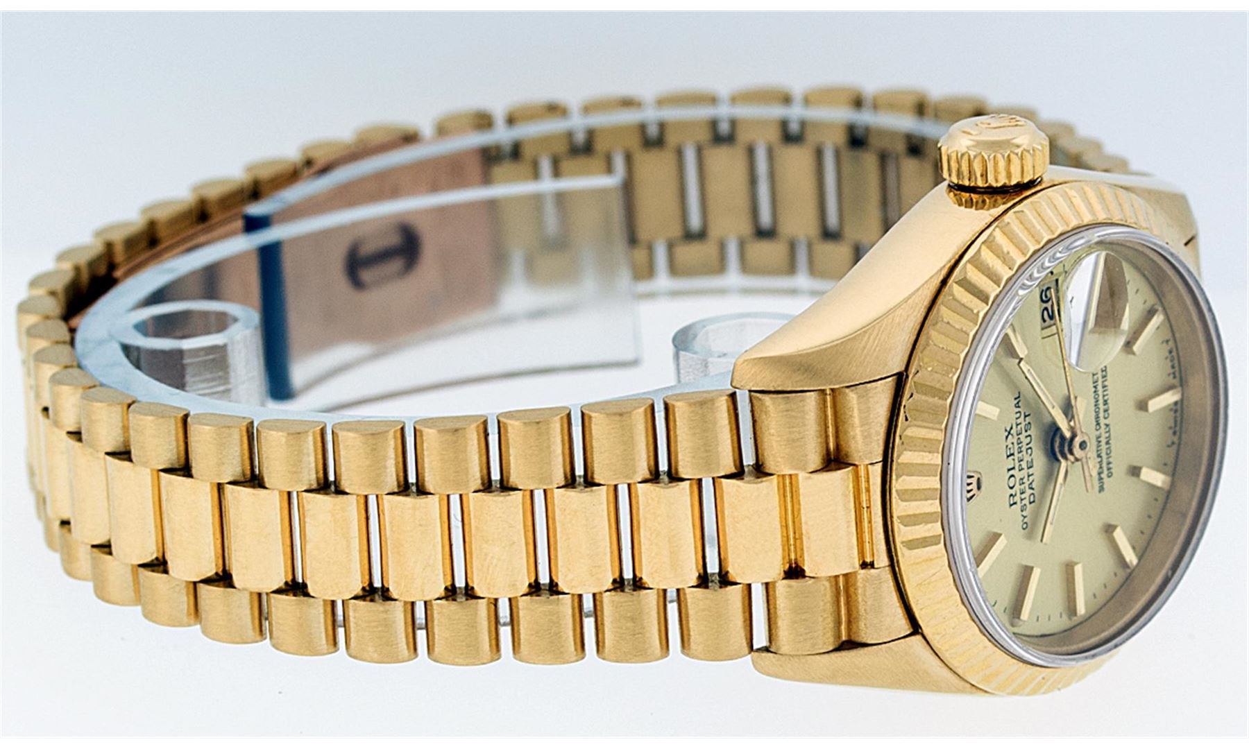 One Ladies 18K Quickset No Hole Rolex President Polished, Serviced & Electronically Tested, 18K Yellow Gold Case: 26mm, 18K Yellow Gold Crown. Custom Crystal: Synthetic Sapphire Cyclops Lens. Movement: Automatic Winding Movement Caliber 2135. Dial: Champagne Index Dial. Date Window: 3 O'Clock Position, Model: Datejust President, Quickset, Condition: G-6 Extra Fine The Watch Is In Very Good Condition Free Of All Scratches And Dents. Bracelet: 18K Yellow Gold President With Hidden Clasp, Bright & Satin Polish. 6.0 Inch Length, Standard President Clasp (Hidden Clasp), With Rolex Logo.