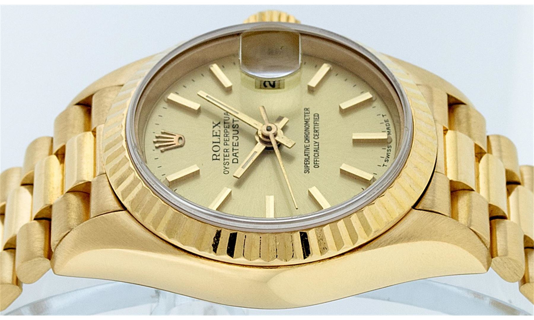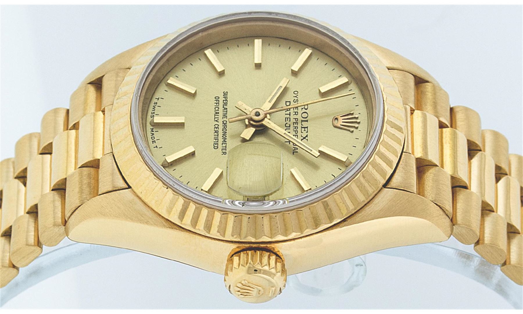 One Ladies 18K Quickset No Hole Rolex President Polished, Serviced & Electronically Tested, 18K Yellow Gold Case: 26mm, 18K Yellow Gold Crown. Custom Crystal: Synthetic Sapphire Cyclops Lens. Movement: Automatic Winding Movement Caliber 2135. Dial: Champagne Index Dial. Date Window: 3 O'Clock Position, Model: Datejust President, Quickset, Condition: G-6 Extra Fine The Watch Is In Very Good Condition Free Of All Scratches And Dents. Bracelet: 18K Yellow Gold President With Hidden Clasp, Bright & Satin Polish. 6.0 Inch Length, Standard President Clasp (Hidden Clasp), With Rolex Logo.