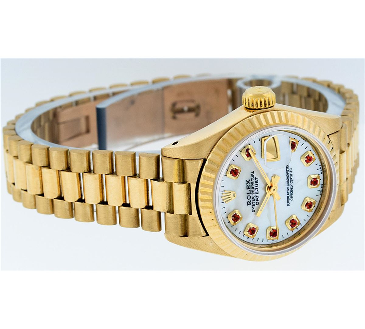One Ladies 18K Rolex President Polished, Serviced & Electronically Tested, Yellow Gold Case: 26mm, 18K Yellow Gold Crown, Bezel: 18K Yellow Gold Fluted Bezel. Custom Crystal: Synthetic Acrylic Cyclops Lens. Movement: Automatic Winding Movement Caliber 2135. Custom Dial: Mother Of Pearl With Rubies, Stone Count: 10 Rubies In Dial. Date Window: 3 O'Clock Position, Quickset, Model: Quickset President Datejust, Condition: G-6 Extra Fine. Bracelet: 18K Yellow Gold President With Hidden Clasp, Bright & Satin Polish. 6.0 Inch Length, Standard President Clasp (Hidden Clasp), With Rolex Logo. Comes with 6 month warranty.