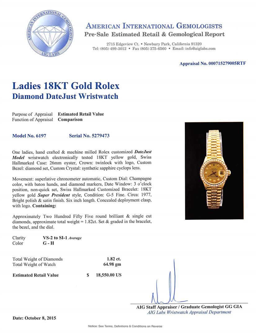 One ladies, hand crafted & machine milled Rolex customized DateJust Model wristwatch electronically tested 18KT yellow gold, Swiss Hallmarked Case: 26mm oyster, Crown: twinlock with logo, Custom Bezel: diamond set, Custom Crystal: synthetic sapphire cyclops lens. Movement: superlative chronometer automatic, Custom Dial: Champagne color, with baton hands, and diamond markers, Date Window: 3 o'clock position, non-quick set, Swiss Hallmarked Customized Bracelet: 18KT yellow gold Super President style, Condition: G-5 Fine. Circa: 1977, Bright polish & satin finish. Six inch length. Concealed deployment clasp, with logo. Containing: Approximately Two Hundred Fifty Five round brilliant & single cut diamonds, approximate total weight = 1.82ct. Set & graded in the bracelet, the bezel, and the dial. Clarity VS-2 to SI-1 Average. Color: G - H. Total Weight of Diamonds 1.82ct. Total Weight of Watch 64.98gm. AIG Appraised at $18,550.00.