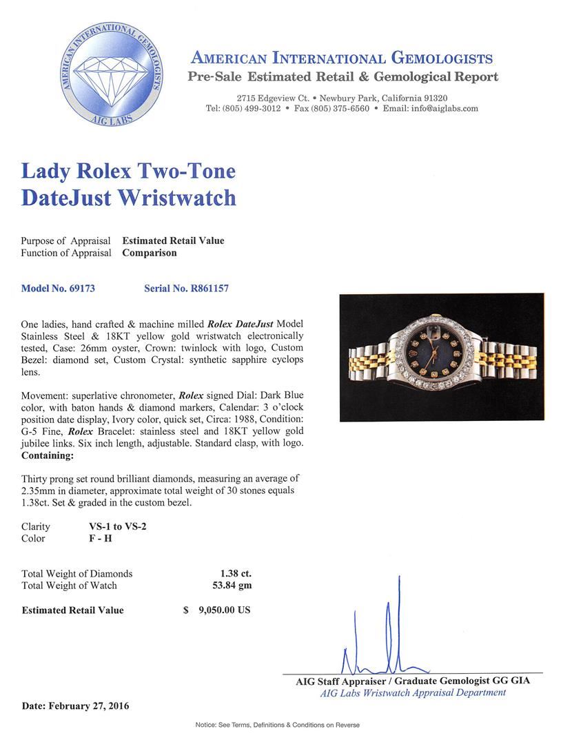 One ladies, hand crafted & machine milled Rolex DateJust Model Stainless Steel & 18KT yellow gold wristwatch electronically tested, Case: 26mm oyster, Crown: twinlock with logo, Custom Bezel: diamond set, Custom Crystal: synthetic sapphire cyclops lens. Movement: superlative chronometer, Rolex signed Dial: Dark Blue color, with baton hands & diamond markers, Calendar: 3 o'clock position date display, Ivory color, quick set, Circa: 1988, Condition: G-5 Fine, Rolex Bracelet: stainless steel and 18KT yellow gold jubilee links. Six inch length, adjustable. Standard clasp, with logo. Containing: Thirty prong set round brilliant diamonds, measuring an average of 2.35mm in diameter, approximate total weight of 30 stones equals 1.38ct. Set & graded in the custom bezel. Clarity: VS-1 to VS-2. Color: F - H. Total Weight of Diamonds 1.38ct. Total Weight of Watch 53.84gm. AIG Appraised at $9,050.00.