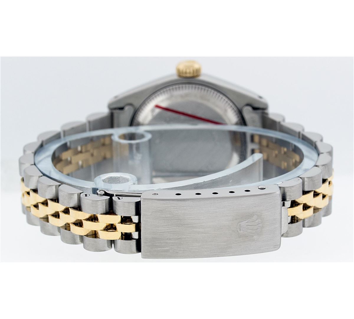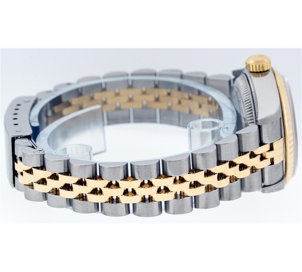 One Ladies Two Tone Quickset Rolex Datejust Polished, Serviced & Electronically Tested, 18K Yellow Gold & Stainless Steel Case:26mm, 18K Yellow Gold Crown, Bezel: 18K Yellow Gold Fluted Bezel. Custom Crystal: Sapphire Cyclops Lens. Movement: Automatic Winding Movement Caliber 2235. Dial: White Index Dial. Date Window: 3 O'Clock Position Date Display, Model: No Hole Quickset Datejust. Condition: G-6 Extra Fine. Bracelet: Two Tone 18K Yellow Gold & Stainless Steel Jubilee Band. Bright Polish. 6.0 Inch Length, Adjustable. Standard Clasp, With Rolex Logo. Comes with 6 month warranty.