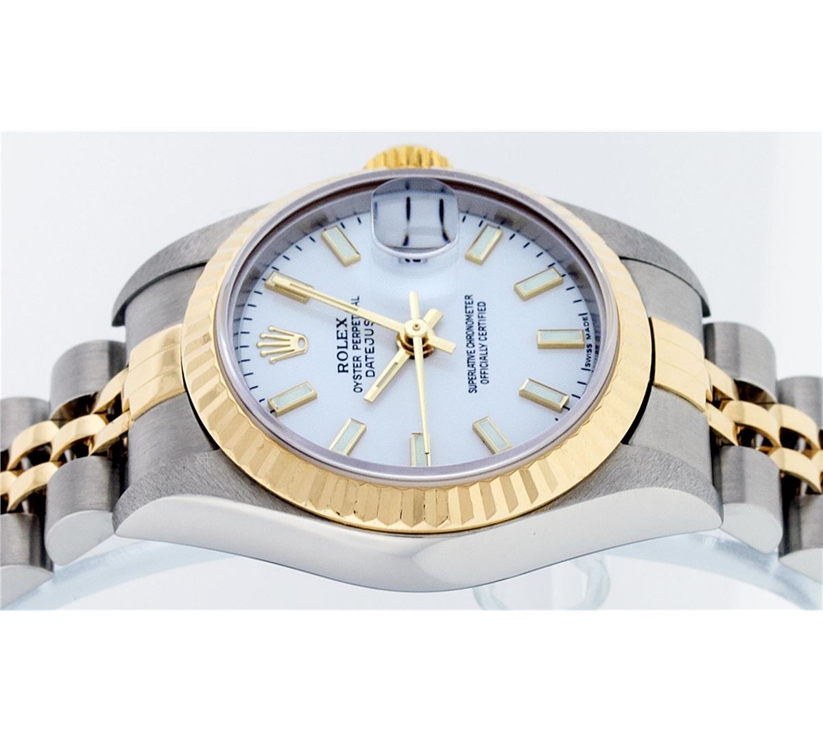 One Ladies Two Tone Quickset Rolex Datejust Polished, Serviced & Electronically Tested, 18K Yellow Gold & Stainless Steel Case:26mm, 18K Yellow Gold Crown, Bezel: 18K Yellow Gold Fluted Bezel. Custom Crystal: Sapphire Cyclops Lens. Movement: Automatic Winding Movement Caliber 2235. Dial: White Index Dial. Date Window: 3 O'Clock Position Date Display, Model: No Hole Quickset Datejust. Condition: G-6 Extra Fine. Bracelet: Two Tone 18K Yellow Gold & Stainless Steel Jubilee Band. Bright Polish. 6.0 Inch Length, Adjustable. Standard Clasp, With Rolex Logo. Comes with 6 month warranty.