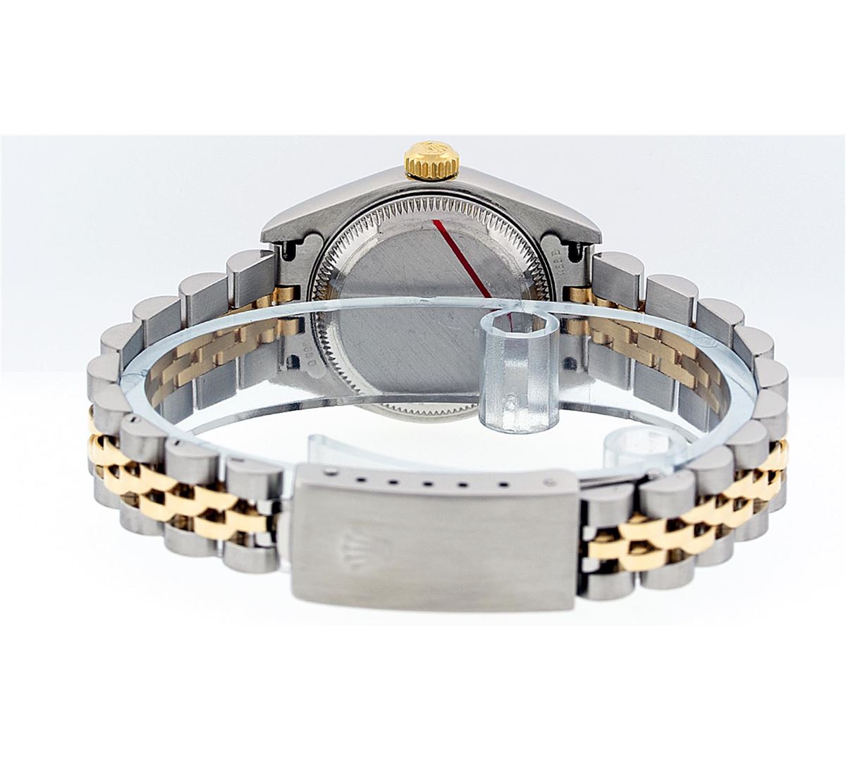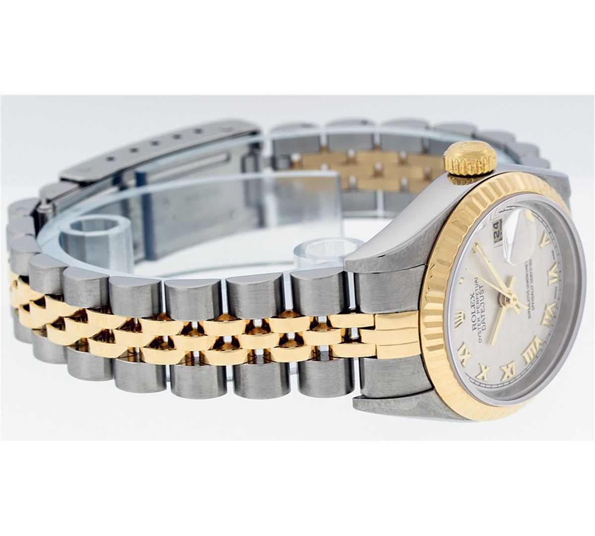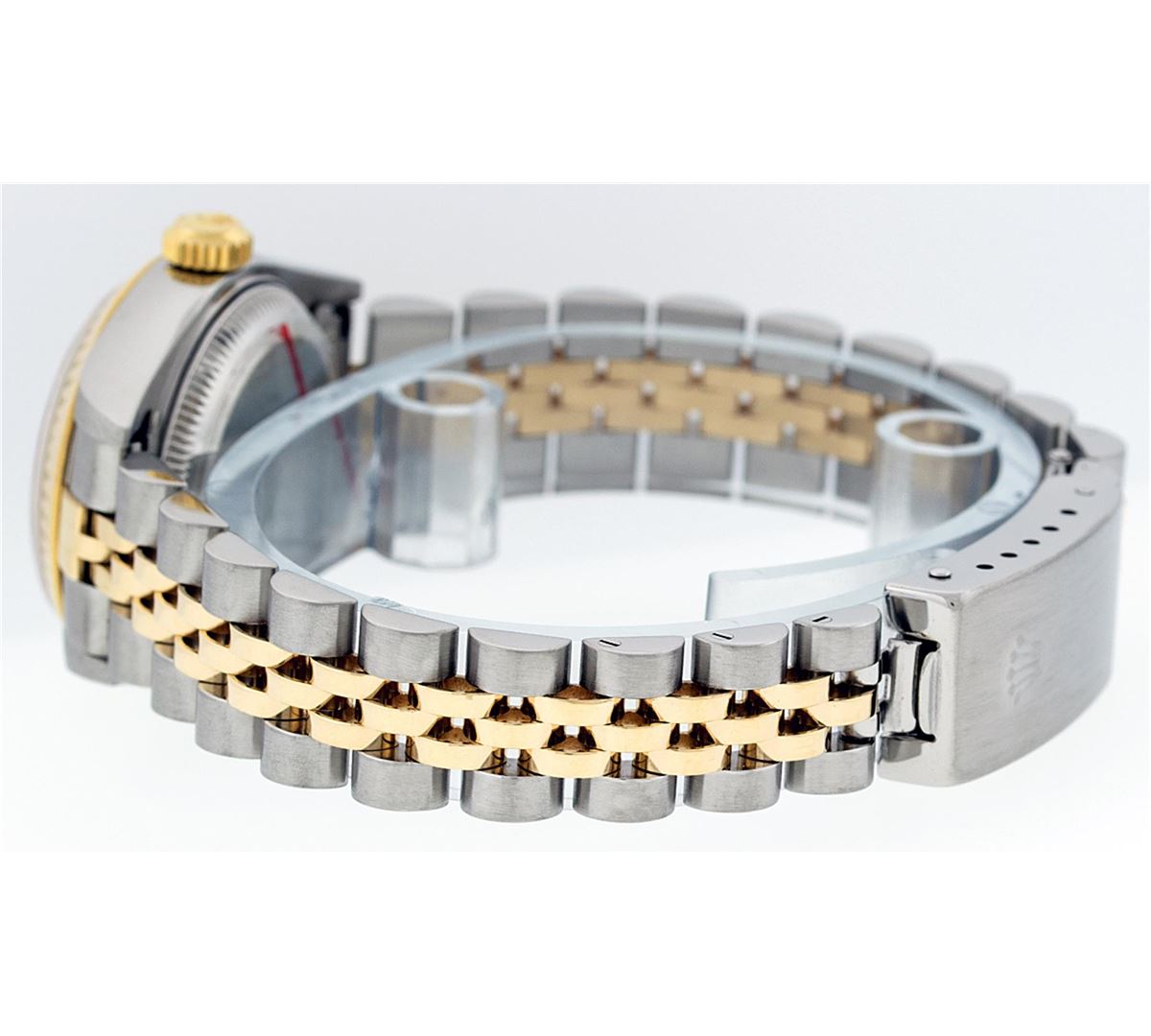 One Ladies Two Tone Quickset Rolex Datejust Polished, Serviced & Electronically Tested, 18K Yellow Gold & Stainless Steel Case:26mm, 18K Yellow Gold Crown, Bezel: 18K Yellow Gold Fluted Bezel. Custom Crystal: Sapphire Cyclops Lens. Movement: Automatic Winding Movement Caliber 2235. Dial: White Roman Dial. Date Window: 3 O'Clock Position Date Display, Model: No Hole Quickset Datejust. Condition: G-6 Extra Fine. Bracelet: Two Tone 18K Yellow Gold & Stainless Steel Jubilee Band. Bright Polish. 6.0 Inch Length, Adjustable. Standard Clasp, With Rolex Logo. Comes with 6 month warranty.