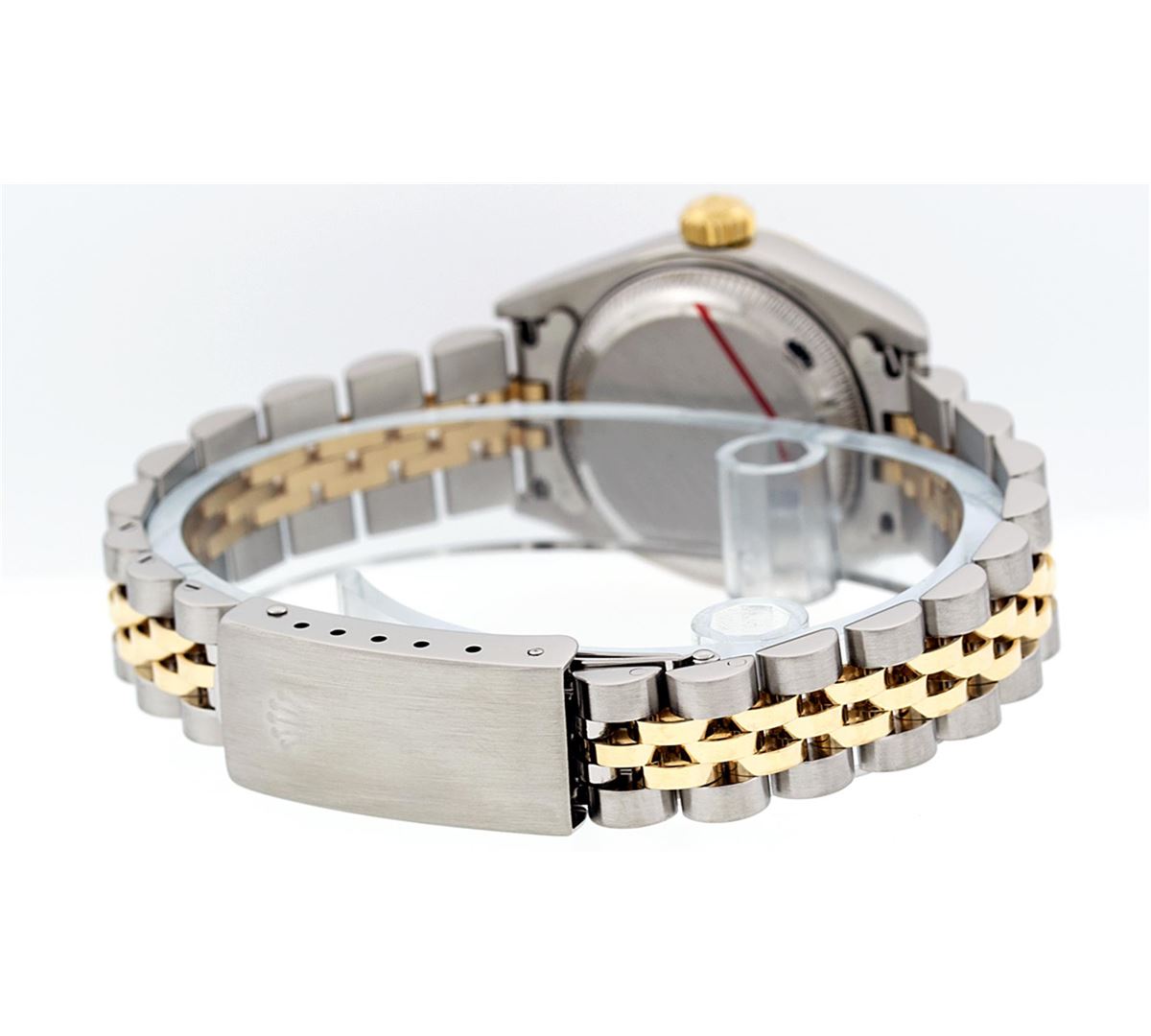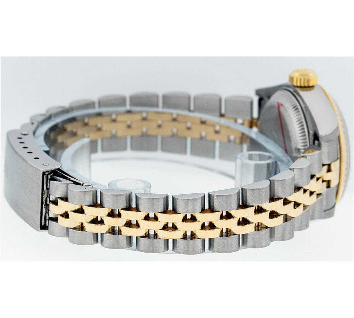 One Ladies Two Tone Quickset Rolex Datejust Polished, Serviced & Electronically Tested, 18K Yellow Gold & Stainless Steel Case:26mm, 18K Yellow Gold Crown, Bezel: 18K Yellow Gold Fluted Bezel. Custom Crystal: Sapphire Cyclops Lens. Movement: Automatic Winding Movement Caliber 2235. Dial: Pyramid Roman Dial. Date Window: 3 O'Clock Position Date Display, Model: No Hole Quickset Datejust. Condition: G-6 Extra Fine. Bracelet: Two Tone 18K Yellow Gold & Stainless Steel Jubilee Band. Bright Polish. 6.0 Inch Length, Adjustable. Standard Clasp, With Rolex Logo. Comes with 6 month warranty.