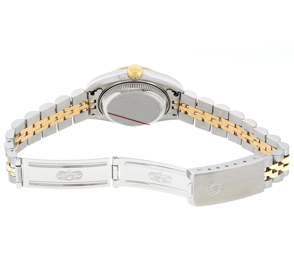 One Ladies Two Tone Quickset Rolex Datejust Polished, Serviced & Electronically Tested, 18K Yellow Gold & Stainless Steel Case:26mm, 18K Yellow Gold Crown, Bezel: 18K Yellow Gold Fluted Bezel. Custom Crystal: Sapphire Cyclops Lens. Movement: Automatic Winding Movement Caliber 2235. Dial: White Index Dial. Date Window: 3 O'Clock Position Date Display, Model: No Hole Quickset Datejust. Condition: G-6 Extra Fine. Bracelet: Two Tone 18K Yellow Gold & Stainless Steel Jubilee Band. Bright Polish. 6.0 Inch Length, Adjustable. Standard Clasp, With Rolex Logo. Comes with 6 month warranty.