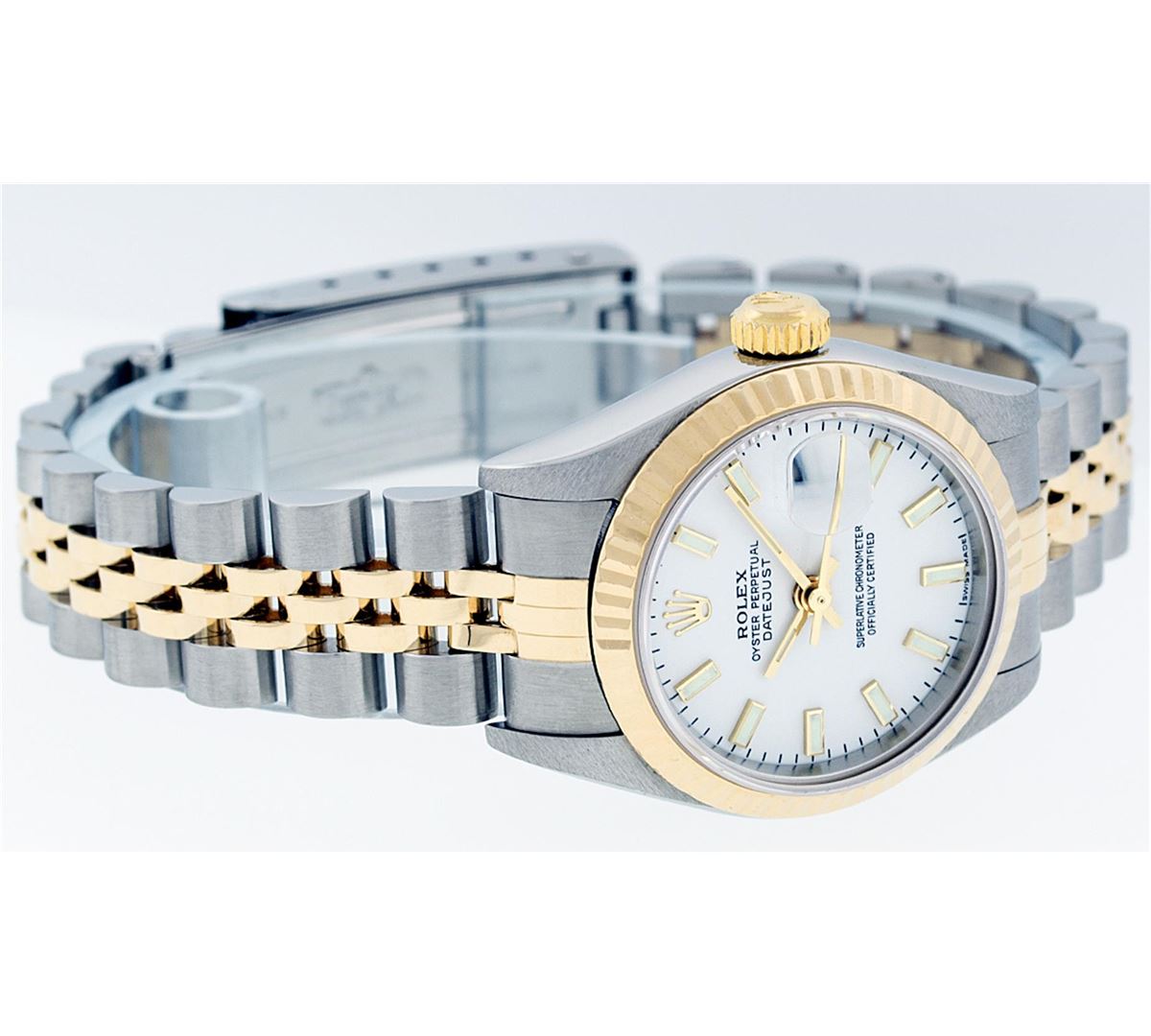 One Ladies Two Tone Quickset Rolex Datejust Polished, Serviced & Electronically Tested, 18K Yellow Gold & Stainless Steel Case:26mm, 18K Yellow Gold Crown, Bezel: 18K Yellow Gold Fluted Bezel. Custom Crystal: Sapphire Cyclops Lens. Movement: Automatic Winding Movement Caliber 2235. Dial: White Index Dial. Date Window: 3 O'Clock Position Date Display, Model: No Hole Quickset Datejust. Condition: G-6 Extra Fine. Bracelet: Two Tone 18K Yellow Gold & Stainless Steel Jubilee Band. Bright Polish. 6.0 Inch Length, Adjustable. Standard Clasp, With Rolex Logo. Comes with 6 month warranty.