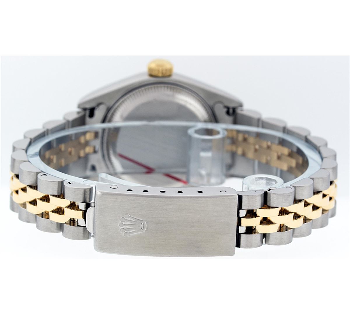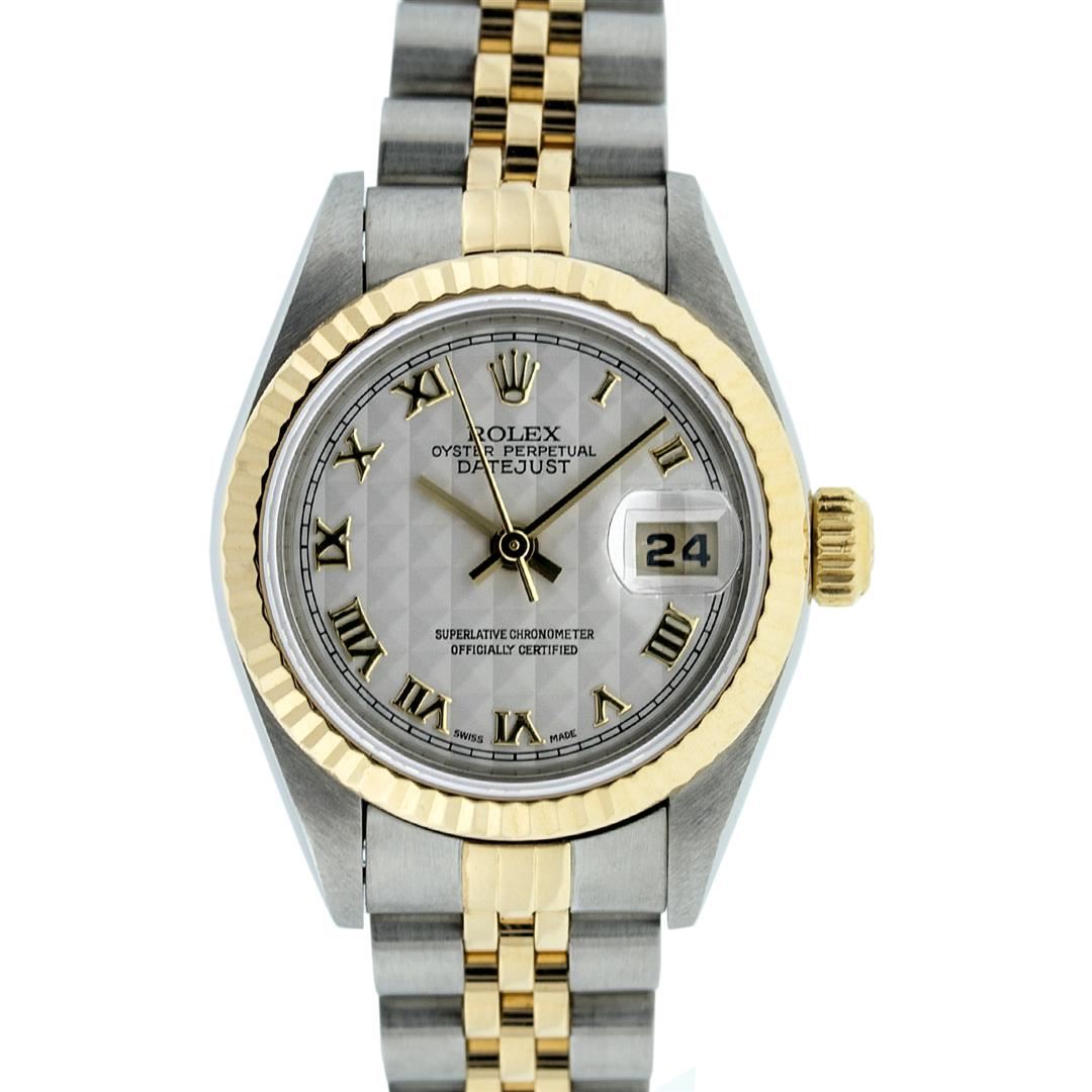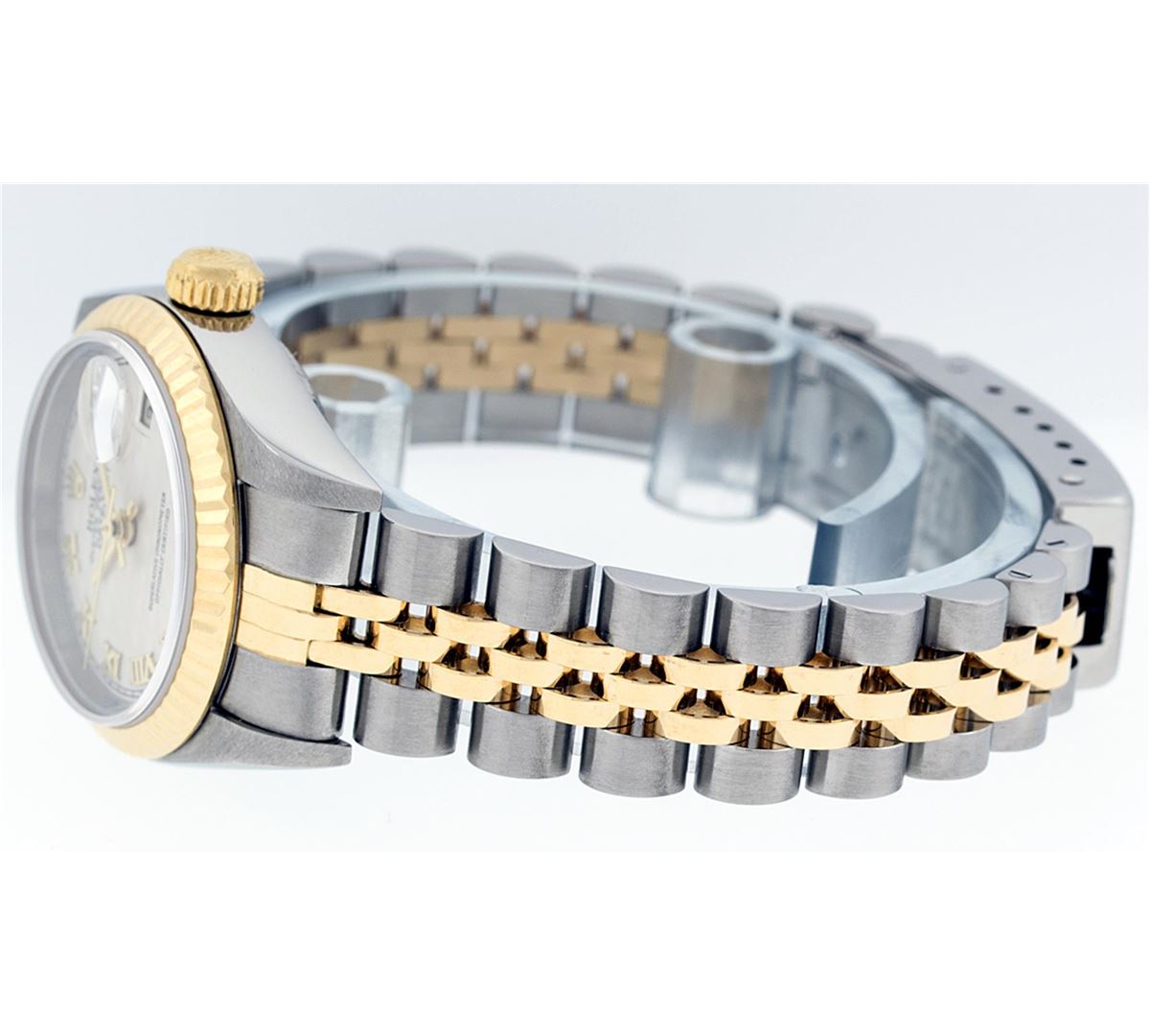 One Ladies Two Tone Quickset Rolex Datejust Polished, Serviced & Electronically Tested, 18K Yellow Gold & Stainless Steel Case:26mm, 18K Yellow Gold Crown, Bezel: 18K Yellow Gold Fluted Bezel. Custom Crystal: Sapphire Cyclops Lens. Movement: Automatic Winding Movement Caliber 2235. Dial: Pyramid Roman Dial. Date Window: 3 O'Clock Position Date Display, Model: No Hole Quickset Datejust. Condition: G-6 Extra Fine. Bracelet: Two Tone 18K Yellow Gold & Stainless Steel Jubilee Band. Bright Polish. 6.0 Inch Length, Adjustable. Standard Clasp, With Rolex Logo. Comes with 6 month warranty.