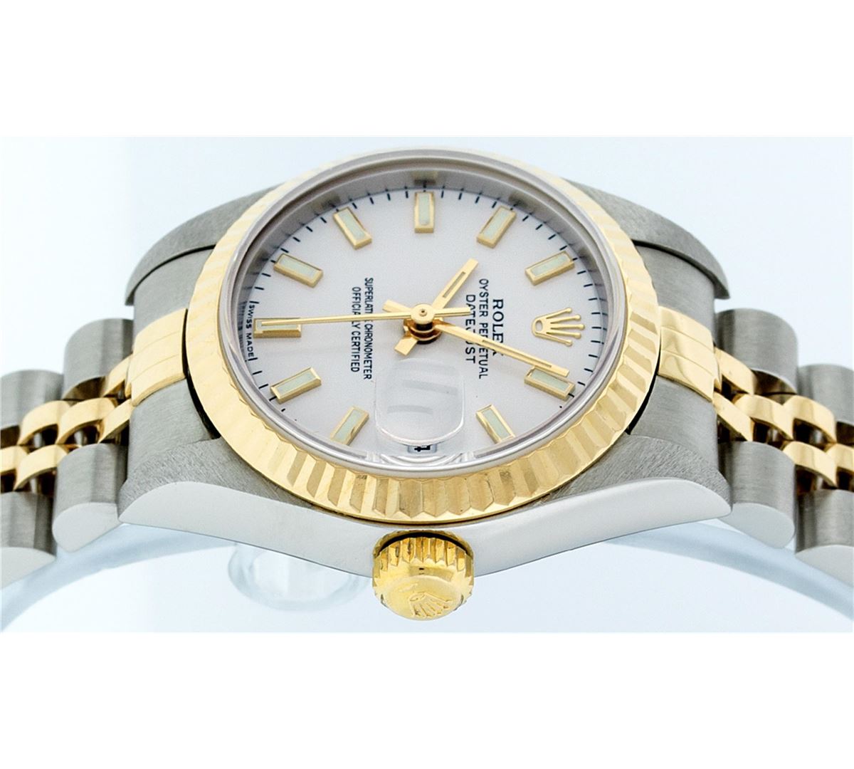 One Ladies Two Tone Quickset Rolex Datejust Polished, Serviced & Electronically Tested, 18K Yellow Gold & Stainless Steel Case:26mm, 18K Yellow Gold Crown, Bezel: 18K Yellow Gold Fluted Bezel. Custom Crystal: Sapphire Cyclops Lens. Movement: Automatic Winding Movement Caliber 2235. Dial: White Index Dial. Date Window: 3 O'Clock Position Date Display, Model: No Hole Quickset Datejust. Condition: G-6 Extra Fine. Bracelet: Two Tone 18K Yellow Gold & Stainless Steel Jubilee Band. Bright Polish. 6.0 Inch Length, Adjustable. Standard Clasp, With Rolex Logo. Comes with 6 month warranty.