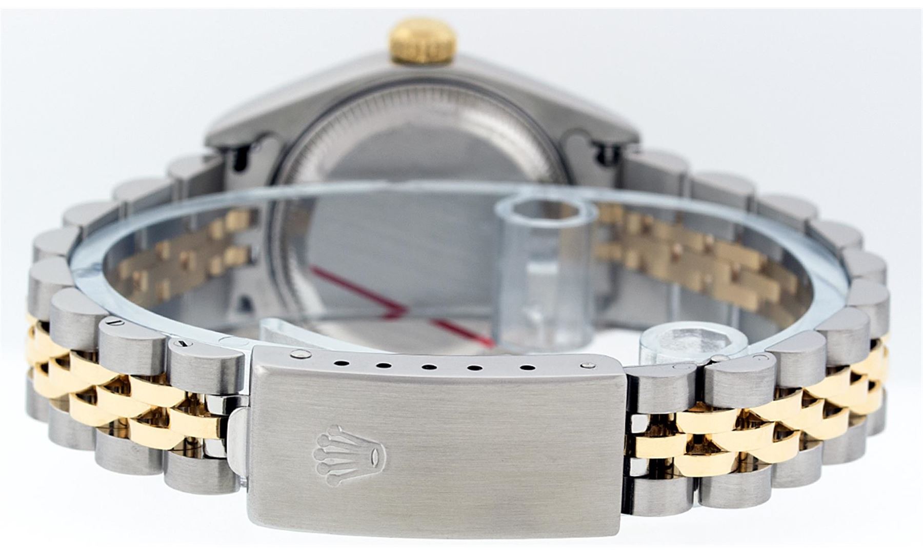 One Ladies Two Tone Quickset Rolex Datejust Polished, Serviced & Electronically Tested, 18K Yellow Gold & Stainless Steel Case:26mm, 18K Yellow Gold Crown, Bezel: 18K Yellow Gold Fluted Bezel. Custom Crystal: Sapphire Cyclops Lens. Movement: Automatic Winding Movement Caliber 2235. Dial: Pyramid Roman Dial. Date Window: 3 O'Clock Position Date Display, Model: No Hole Quickset Datejust. Condition: G-6 Extra Fine. Bracelet: Two Tone 18K Yellow Gold & Stainless Steel Jubilee Band. Bright Polish. 6.0 Inch Length, Adjustable. Standard Clasp, With Rolex Logo. Comes with 6 month warranty.