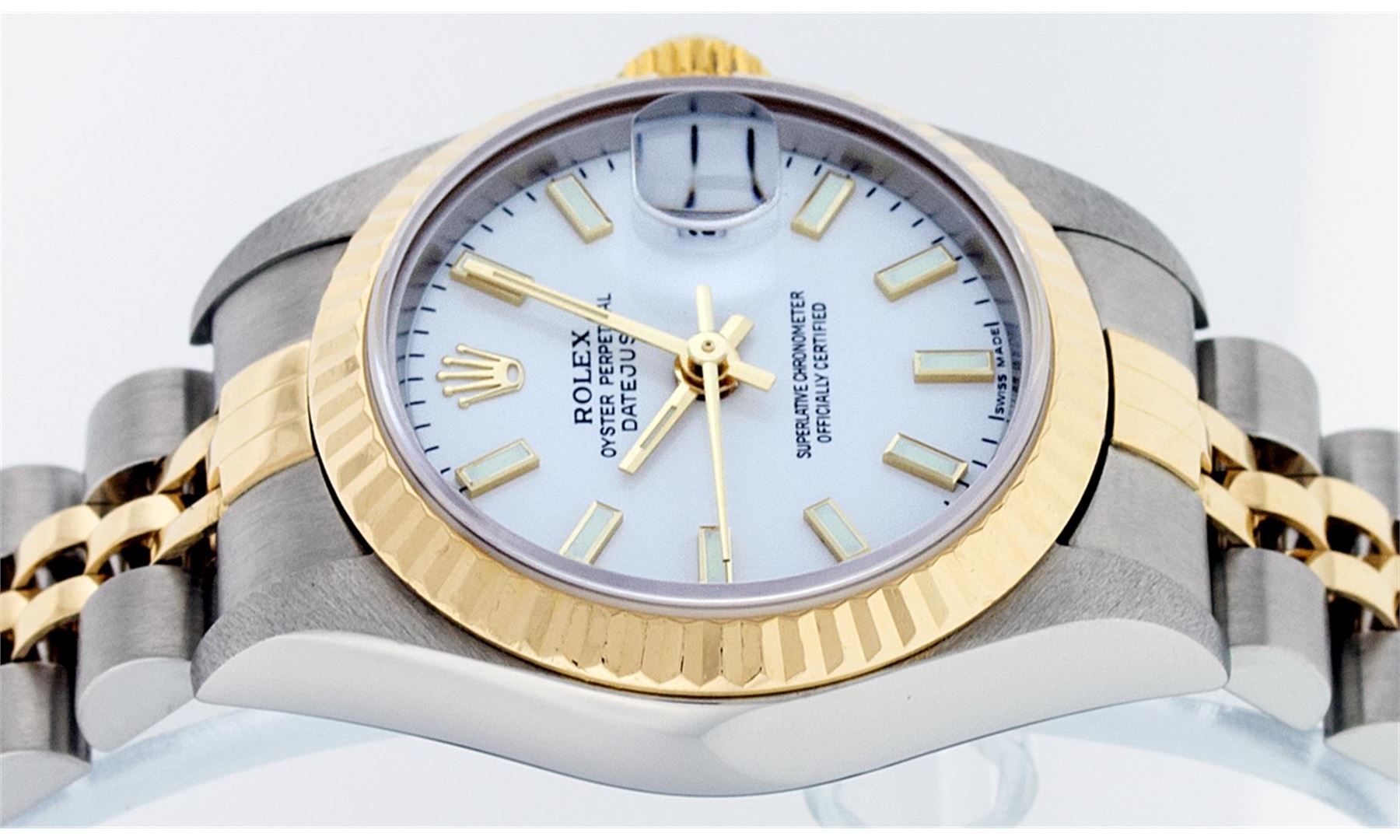 One Ladies Two Tone Quickset Rolex Datejust Polished, Serviced & Electronically Tested, 18K Yellow Gold & Stainless Steel Case:26mm, 18K Yellow Gold Crown, Bezel: 18K Yellow Gold Fluted Bezel. Custom Crystal: Sapphire Cyclops Lens. Movement: Automatic Winding Movement Caliber 2235. Dial: White Index Dial. Date Window: 3 O'Clock Position Date Display, Model: No Hole Quickset Datejust. Condition: G-6 Extra Fine. Bracelet: Two Tone 18K Yellow Gold & Stainless Steel Jubilee Band. Bright Polish. 6.0 Inch Length, Adjustable. Standard Clasp, With Rolex Logo. Comes with 6 month warranty.