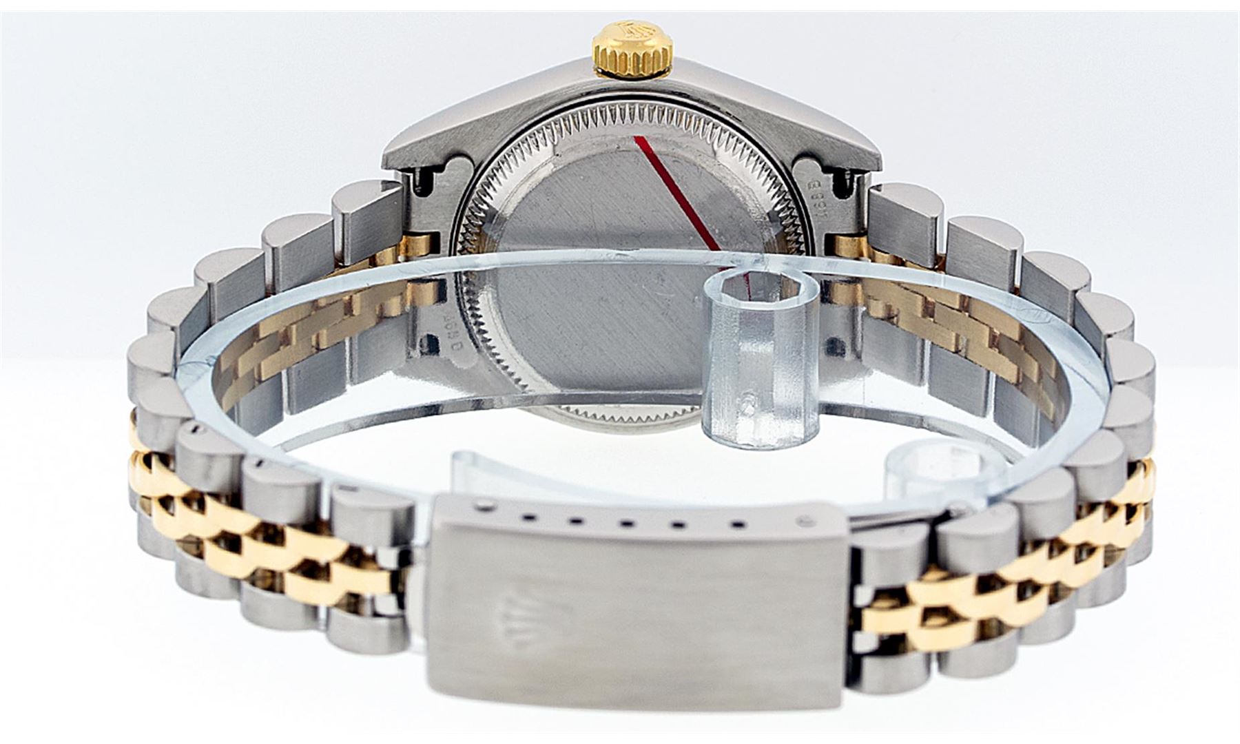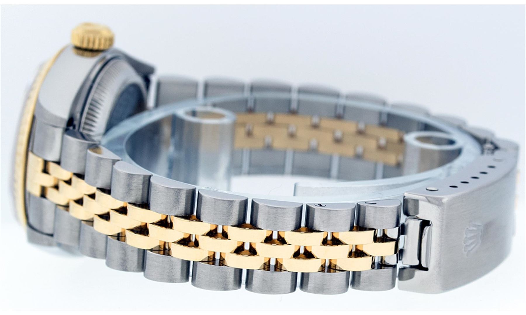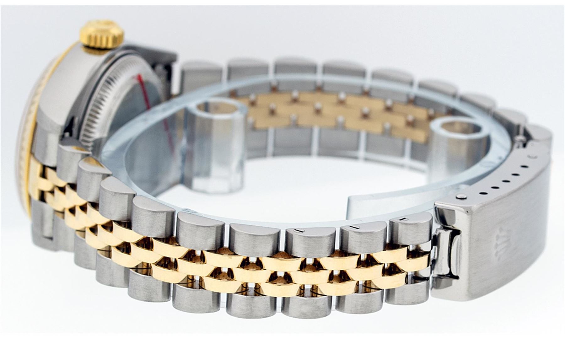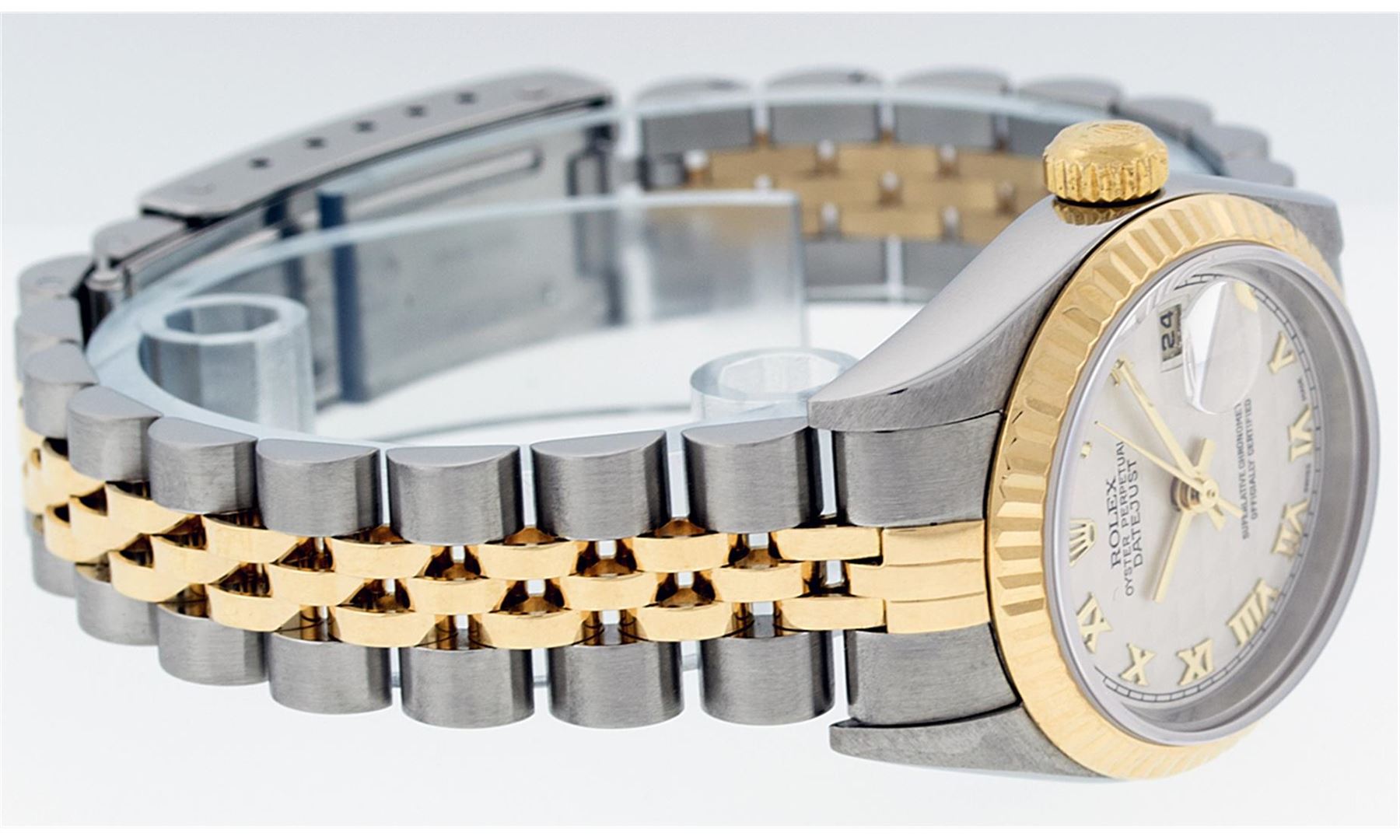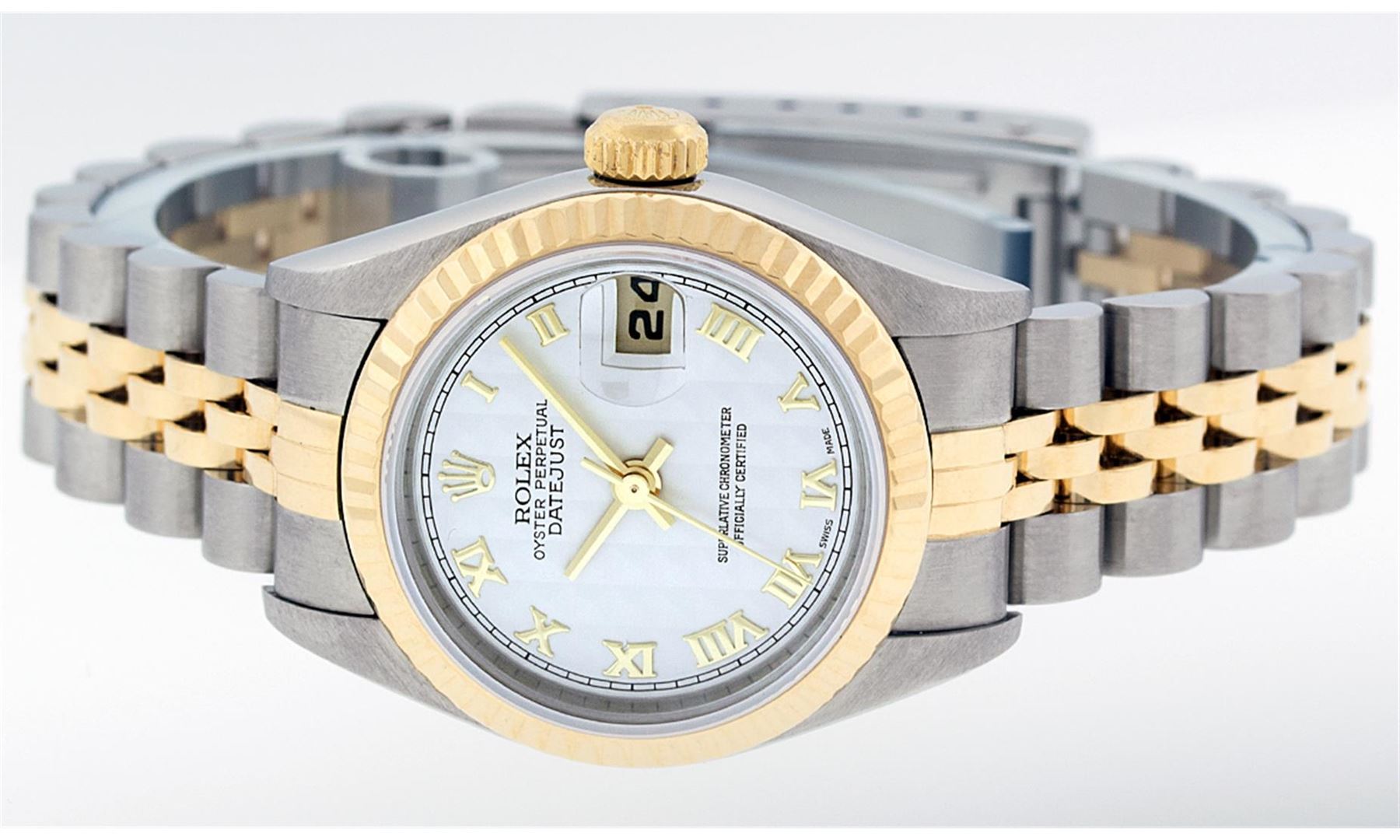 One Ladies Two Tone Quickset Rolex Datejust Polished, Serviced & Electronically Tested, 18K Yellow Gold & Stainless Steel Case:26mm, 18K Yellow Gold Crown, Bezel: 18K Yellow Gold Fluted Bezel. Custom Crystal: Sapphire Cyclops Lens. Movement: Automatic Winding Movement Caliber 2235. Dial: White Roman Dial. Date Window: 3 O'Clock Position Date Display, Model: No Hole Quickset Datejust. Condition: G-6 Extra Fine. Bracelet: Two Tone 18K Yellow Gold & Stainless Steel Jubilee Band. Bright Polish. 6.0 Inch Length, Adjustable. Standard Clasp, With Rolex Logo. Comes with 6 month warranty.