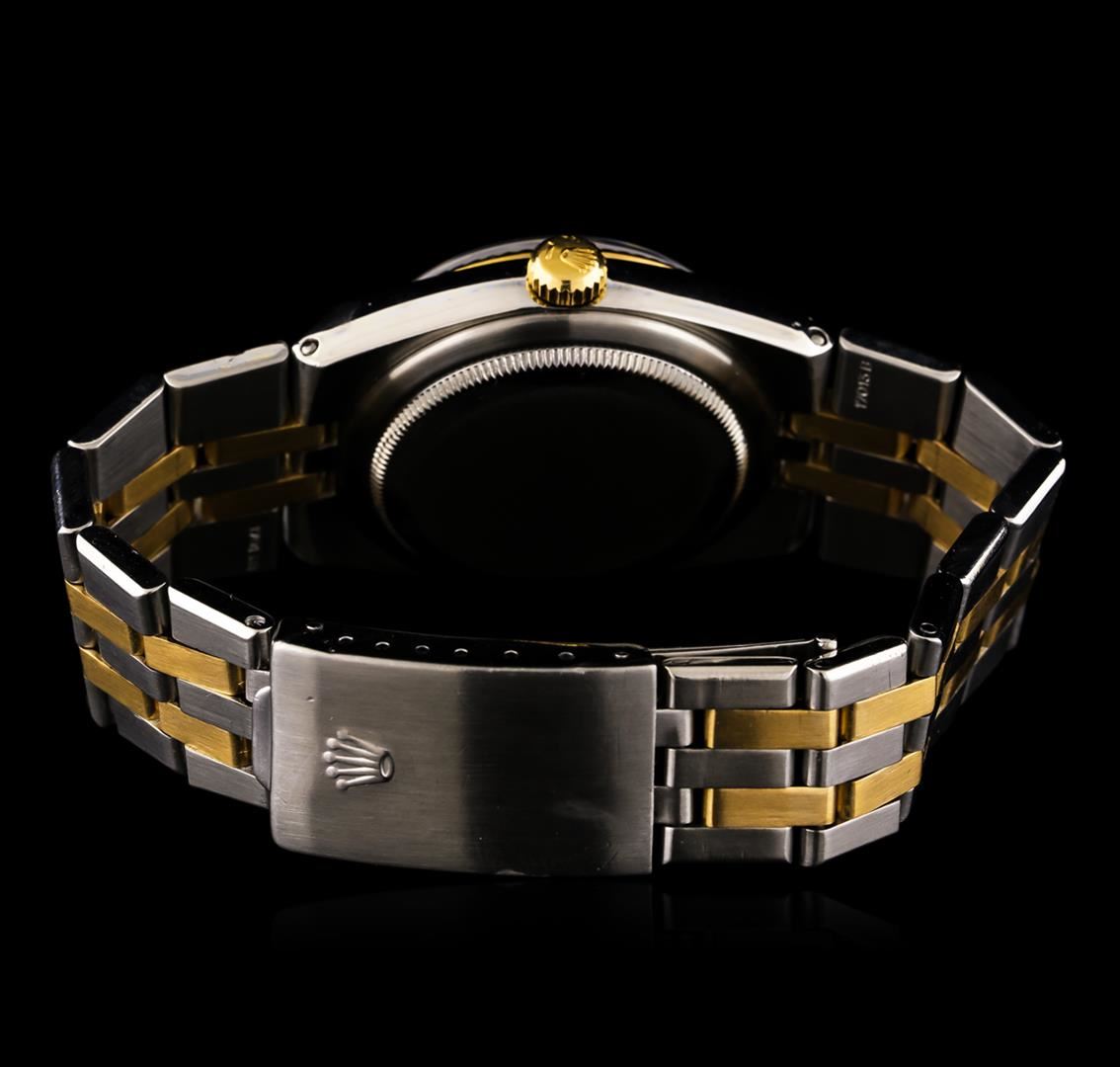One gents, hand crafted & machine milled Rolex two-tone OysterQuartz DateJust wristwatch electronically tested, Stainless Steel Case: 36mm OysterQuartz, 18KT yellow gold Crown: twinlock with logo, 18KT yellow gold Bezel: fluted, Crystal: synthetic sapphire cyclops lens. Circa: 1984.Movement: Swiss quartz chronometer, Dial: Silver color, with baton hands and indices, Date Window: 3 o'clock position, quick set, Bracelet: two-tone 18KT yellow gold & stainless steel, OysterQuartz, Condition: G-6 Extra Fine. Bright polish and brushed finish. Eight inch length, adjustable. Total Weight of Watch 124.35gm. AIG Appraised at $6,550.00.