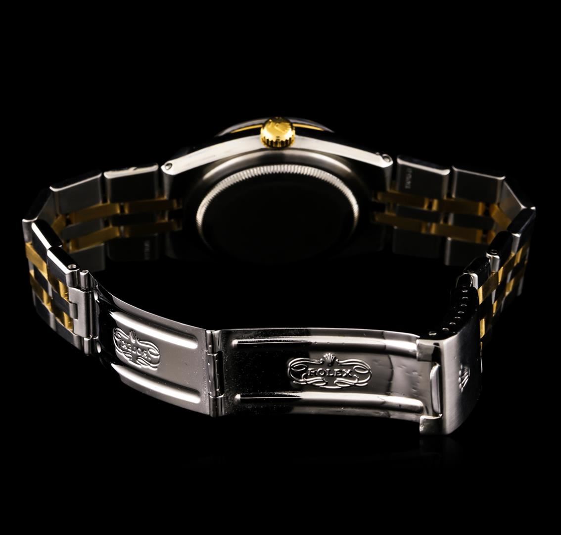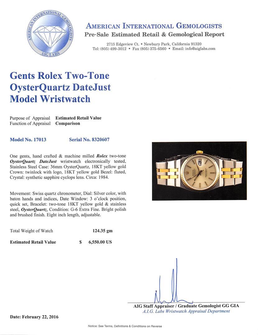 One gents, hand crafted & machine milled Rolex two-tone OysterQuartz DateJust wristwatch electronically tested, Stainless Steel Case: 36mm OysterQuartz, 18KT yellow gold Crown: twinlock with logo, 18KT yellow gold Bezel: fluted, Crystal: synthetic sapphire cyclops lens. Circa: 1984.Movement: Swiss quartz chronometer, Dial: Silver color, with baton hands and indices, Date Window: 3 o'clock position, quick set, Bracelet: two-tone 18KT yellow gold & stainless steel, OysterQuartz, Condition: G-6 Extra Fine. Bright polish and brushed finish. Eight inch length, adjustable. Total Weight of Watch 124.35gm. AIG Appraised at $6,550.00.