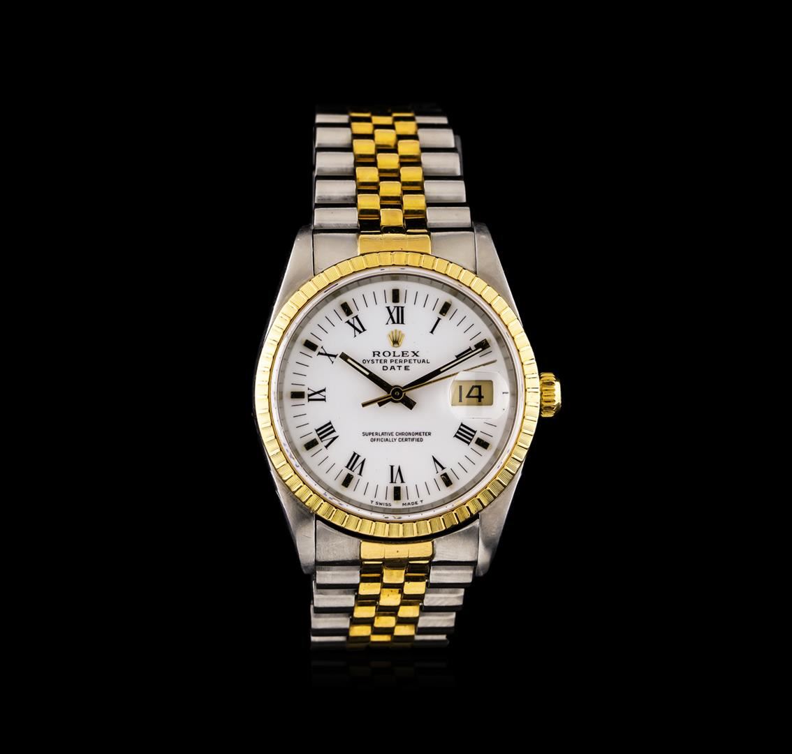 One gents, hand crafted & machine milled Rolex Date Model wristwatch electronically tested. Stainless Steel, Case: 34mm oyster, 18KT yellow gold Crown: twin lock with logo, 18KT yellow gold Bezel: engine turned, Custom Crystal: synthetic sapphire cyclops lens. Movement: automatic superlative chronometer, Rolex signed Dial: Porcelain White color, with baton hands, raised indices, Roman numerals, and a bordering minute track, Calendar: 3 o'clock position date window display, quick set, Rolex Bracelet: 18KT yellow gold & stainless steel Jubilee link, Condition: G-5 Fine. Circa: 1985, Seven and one quarter inch length, adjustable. Standard clasp, with logo. Total Weight of Watch 98.14gm. AIG Appraised at $6,750.00.