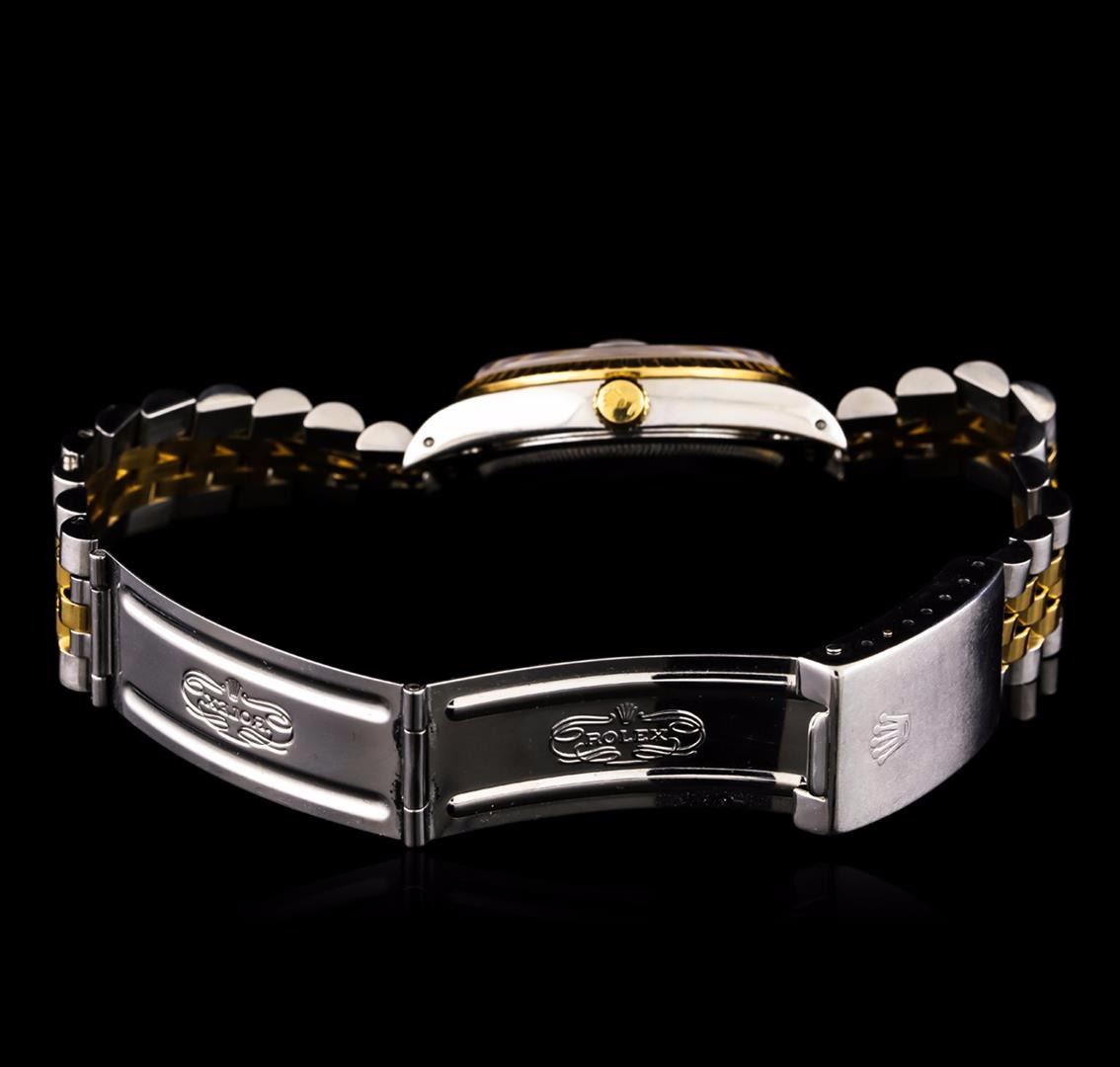 One gents, hand crafted & machine milled Rolex Date Model wristwatch electronically tested. Stainless Steel, Case: 34mm oyster, 18KT yellow gold Crown: twin lock with logo, 18KT yellow gold Bezel: engine turned, Custom Crystal: synthetic sapphire cyclops lens. Movement: automatic superlative chronometer, Rolex signed Dial: Porcelain White color, with baton hands, raised indices, Roman numerals, and a bordering minute track, Calendar: 3 o'clock position date window display, quick set, Rolex Bracelet: 18KT yellow gold & stainless steel Jubilee link, Condition: G-5 Fine. Circa: 1985, Seven and one quarter inch length, adjustable. Standard clasp, with logo. Total Weight of Watch 98.14gm. AIG Appraised at $6,750.00.