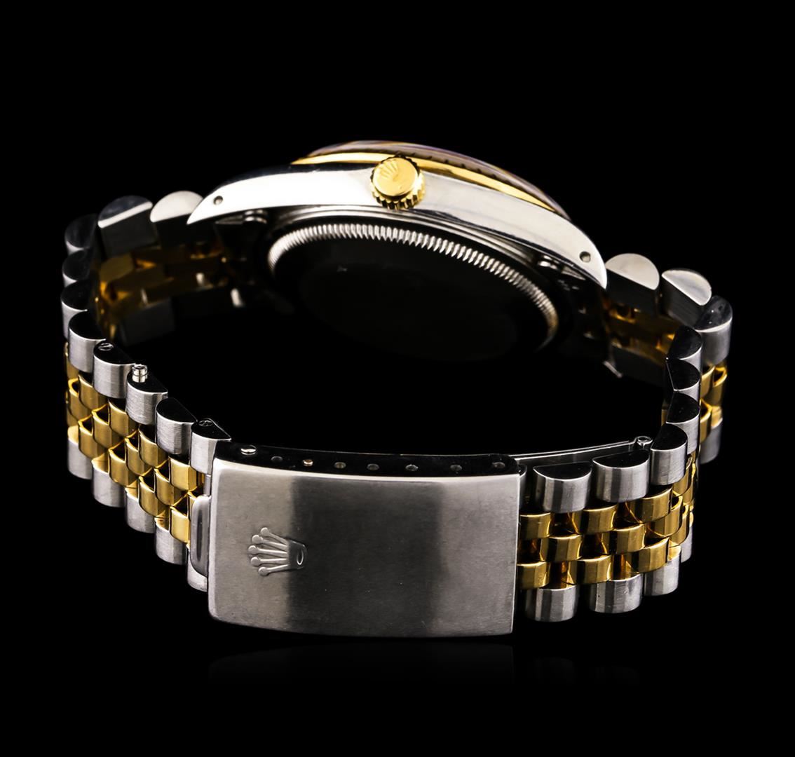 One gents, hand crafted & machine milled Rolex Date Model wristwatch electronically tested. Stainless Steel, Case: 34mm oyster, 18KT yellow gold Crown: twin lock with logo, 18KT yellow gold Bezel: engine turned, Custom Crystal: synthetic sapphire cyclops lens. Movement: automatic superlative chronometer, Rolex signed Dial: Porcelain White color, with baton hands, raised indices, Roman numerals, and a bordering minute track, Calendar: 3 o'clock position date window display, quick set, Rolex Bracelet: 18KT yellow gold & stainless steel Jubilee link, Condition: G-5 Fine. Circa: 1985, Seven and one quarter inch length, adjustable. Standard clasp, with logo. Total Weight of Watch 98.14gm. AIG Appraised at $6,750.00.