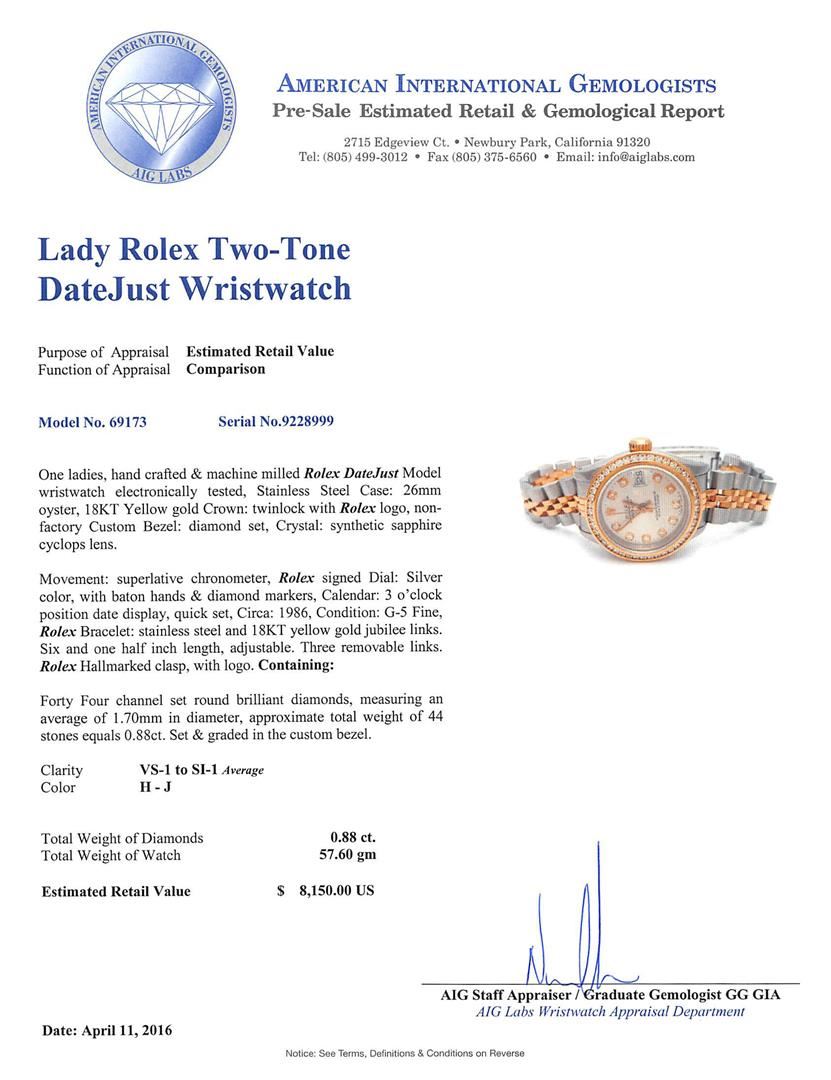 One ladies, hand crafted & machine milled Rolex DateJust Model wristwatch electronically tested, Stainless Steel Case: 26mm oyster, 18KT Yellow gold Crown: twinlock with Rolex logo, non-factory Custom Bezel: diamond set, Crystal: synthetic sapphire cyclops lens. Movement: superlative chronometer, Rolex signed Dial: Silver color, with baton hands & diamond markers, Calendar: 3 o'clock position date display, quick set, Circa: 1986, Condition: G-5 Fine, Rolex Bracelet: stainless steel and 18KT yellow gold jubilee links. Six and one half inch length, adjustable. Three removable links. Rolex Hallmarked clasp, with logo. Containing: Forty Four channel set round brilliant diamonds, measuring an average of 1.70mm in diameter, approximate total weight of 44 stones equals 0.88ct. Set & graded in the custom bezel. Clarity: VS-1 to SI-1 Average. Color: H - J. Total Weight of Diamonds 0.88ct. Total Weight of Watch 57.60gm. AIG Appraised at $8,150.00.