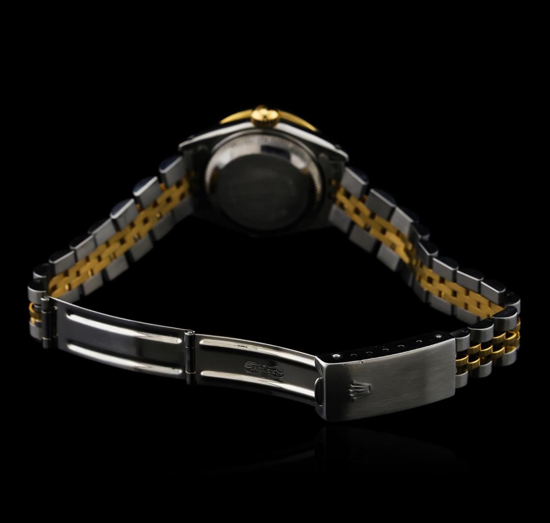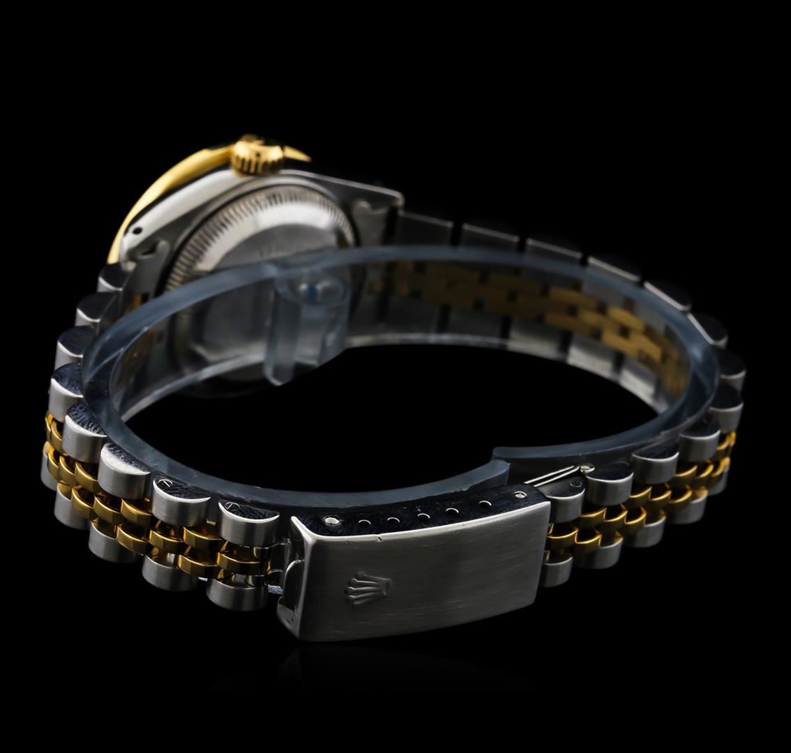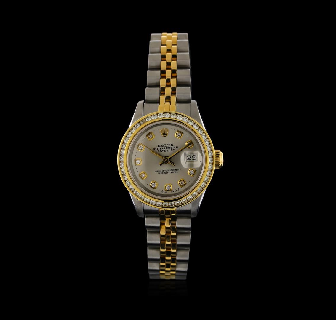 One ladies, hand crafted & machine milled Rolex DateJust Model wristwatch electronically tested, Stainless Steel Case: 26mm oyster, 18KT Yellow gold Crown: twinlock with Rolex logo, non-factory Custom Bezel: diamond set, Crystal: synthetic sapphire cyclops lens. Movement: superlative chronometer, Rolex signed Dial: Silver color, with baton hands & diamond markers, Calendar: 3 o'clock position date display, quick set, Circa: 1986, Condition: G-5 Fine, Rolex Bracelet: stainless steel and 18KT yellow gold jubilee links. Six and one half inch length, adjustable. Three removable links. Rolex Hallmarked clasp, with logo. Containing: Forty Four channel set round brilliant diamonds, measuring an average of 1.70mm in diameter, approximate total weight of 44 stones equals 0.88ct. Set & graded in the custom bezel. Clarity: VS-1 to SI-1 Average. Color: H - J. Total Weight of Diamonds 0.88ct. Total Weight of Watch 57.60gm. AIG Appraised at $8,150.00.