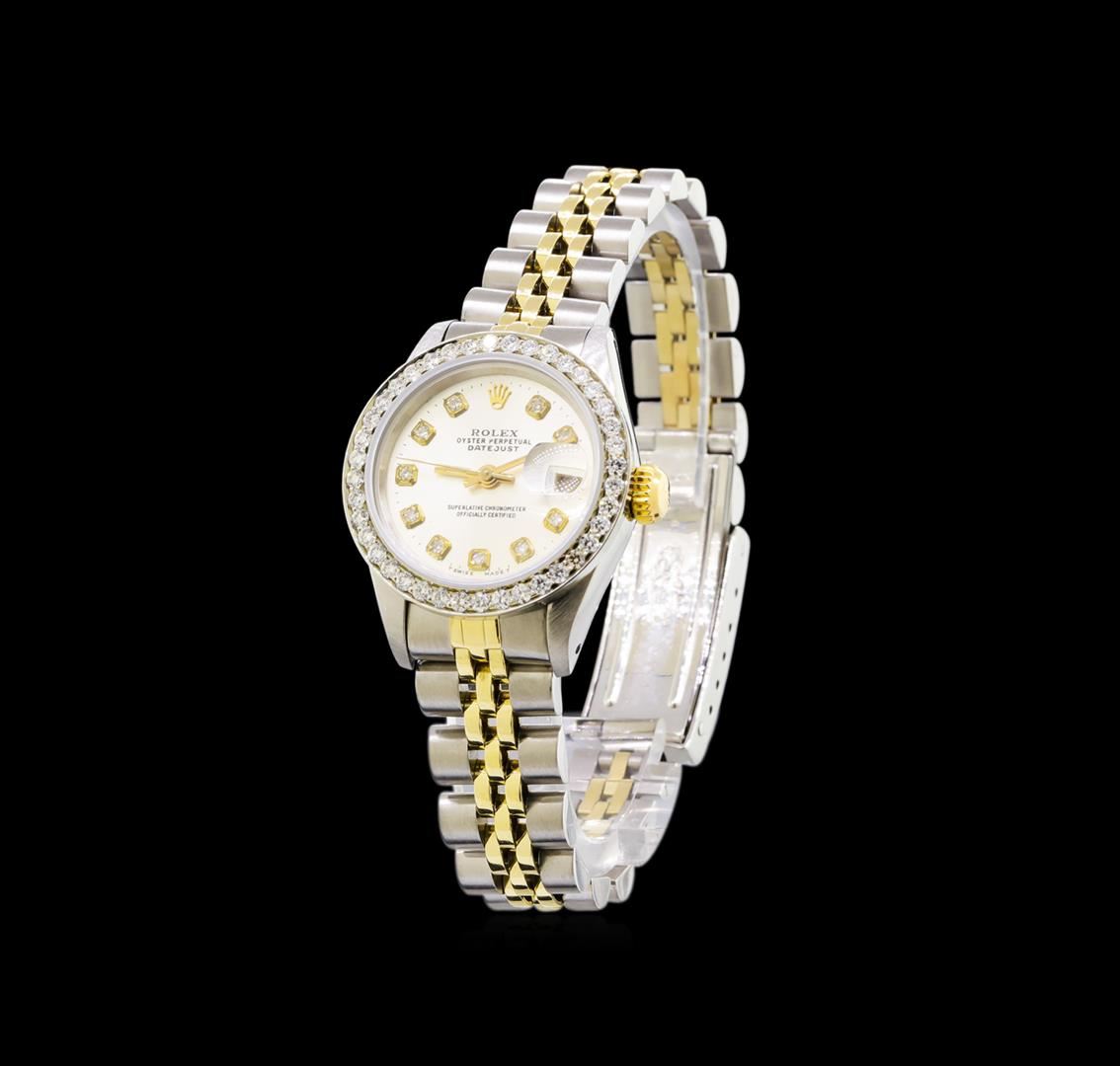 One ladies, hand crafted & machine milled Rolex DateJust Model wristwatch electronically tested, Stainless Steel Case: 26mm oyster, 18KT Yellow gold Crown: twinlock with logo, Custom non-factory Bezel: diamond set, Crystal: synthetic sapphire cyclops lens. Movement: superlative chronometer, Custom non-factory Dial: Silver color, with baton hands & diamond markers, Calendar: 3 o'clock position date display, quick set, Circa: 1988, Condition: G-5 Fine, Rolex Bracelet: stainless steel and 18KT yellow gold jubilee links. Seven inch length, adjustable. Rolex fold over snap locking clasp, with logo. Containing: Forty prong set round brilliant diamonds, measuring an average of 1.75mm in diameter, approximate total weight of 40 stones equals 0.84ct. Set & graded in the custom bezel. Clarity: SI-2 to I-1. Color: G - I. Total Weight of Diamonds 0.84ct. Total Weight of Watch 52.78gm. AIG Appraised at $8,650.00.
