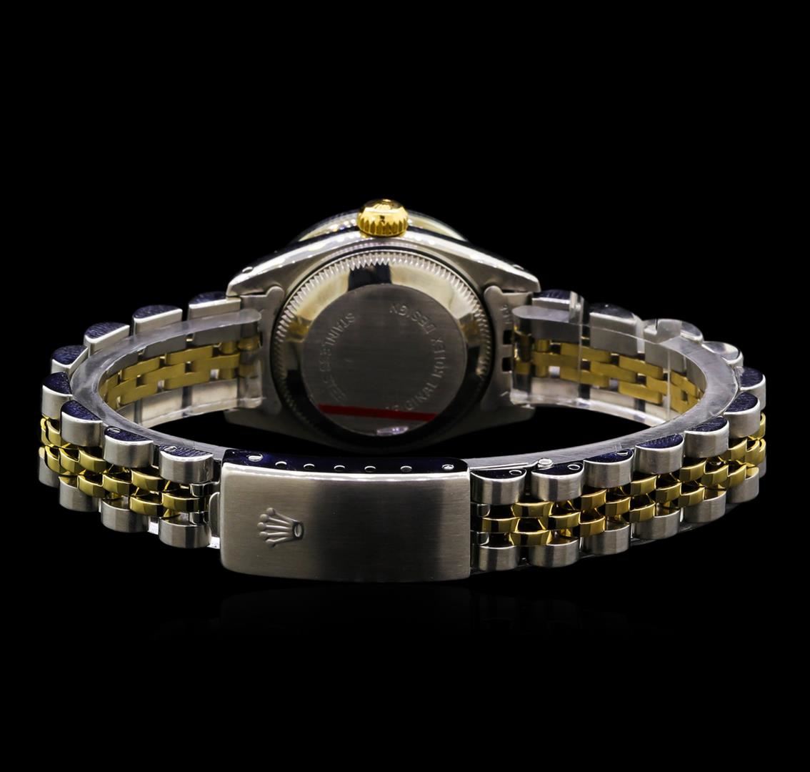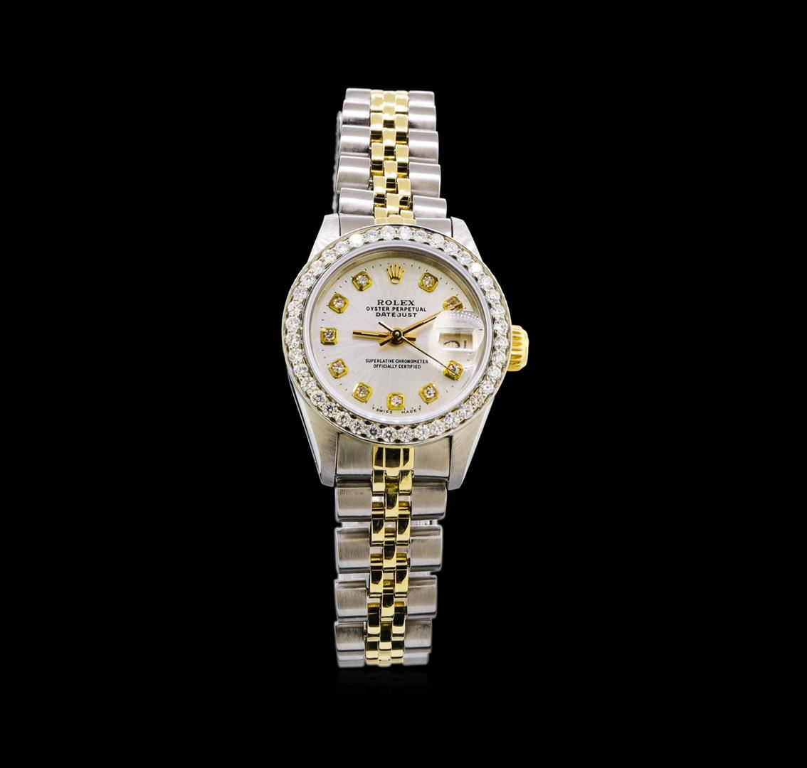 One ladies, hand crafted & machine milled Rolex DateJust Model wristwatch electronically tested, Stainless Steel Case: 26mm oyster, 18KT Yellow gold Crown: twinlock with logo, Custom non-factory Bezel: diamond set, Crystal: synthetic sapphire cyclops lens. Movement: superlative chronometer, Custom non-factory Dial: Silver color, with baton hands & diamond markers, Calendar: 3 o'clock position date display, quick set, Circa: 1988, Condition: G-5 Fine, Rolex Bracelet: stainless steel and 18KT yellow gold jubilee links. Seven inch length, adjustable. Rolex fold over snap locking clasp, with logo. Containing: Forty prong set round brilliant diamonds, measuring an average of 1.75mm in diameter, approximate total weight of 40 stones equals 0.84ct. Set & graded in the custom bezel. Clarity: SI-2 to I-1. Color: G - I. Total Weight of Diamonds 0.84ct. Total Weight of Watch 52.78gm. AIG Appraised at $8,650.00.