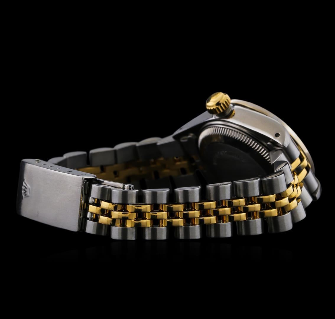 One ladies, hand crafted & machine milled Rolex DateJust Model wristwatch electronically tested, Stainless Steel Case: 26mm oyster, 18KT Yellow gold Crown: twinlock with Rolex logo, non-factory Custom Bezel: diamond set, Crystal: synthetic sapphire cyclops lens. Movement: superlative chronometer, Rolex signed Dial: Black color, with baton hands & diamond markers, Calendar: 3 o'clock position date display, Ivory color, quick set, Circa: 1990, Condition: G-5 Fine, Rolex Bracelet: stainless steel and 18KT yellow gold jubilee links. Six inch length, adjustable. Rolex Hallmarked clasp, with logo. Containing: Forty prong set round brilliant diamonds, measuring an average of 1.60mm in diameter, approximate total weight of 40 stones equals 0.62ct. Set & graded in the custom bezel. Clarity: VS-1 to VS-2 Average. Color: G - I. Total Weight of Diamonds 0.62ct. Total Weight of Watch 50.99gm. AIG Appraised at $8,050.00.