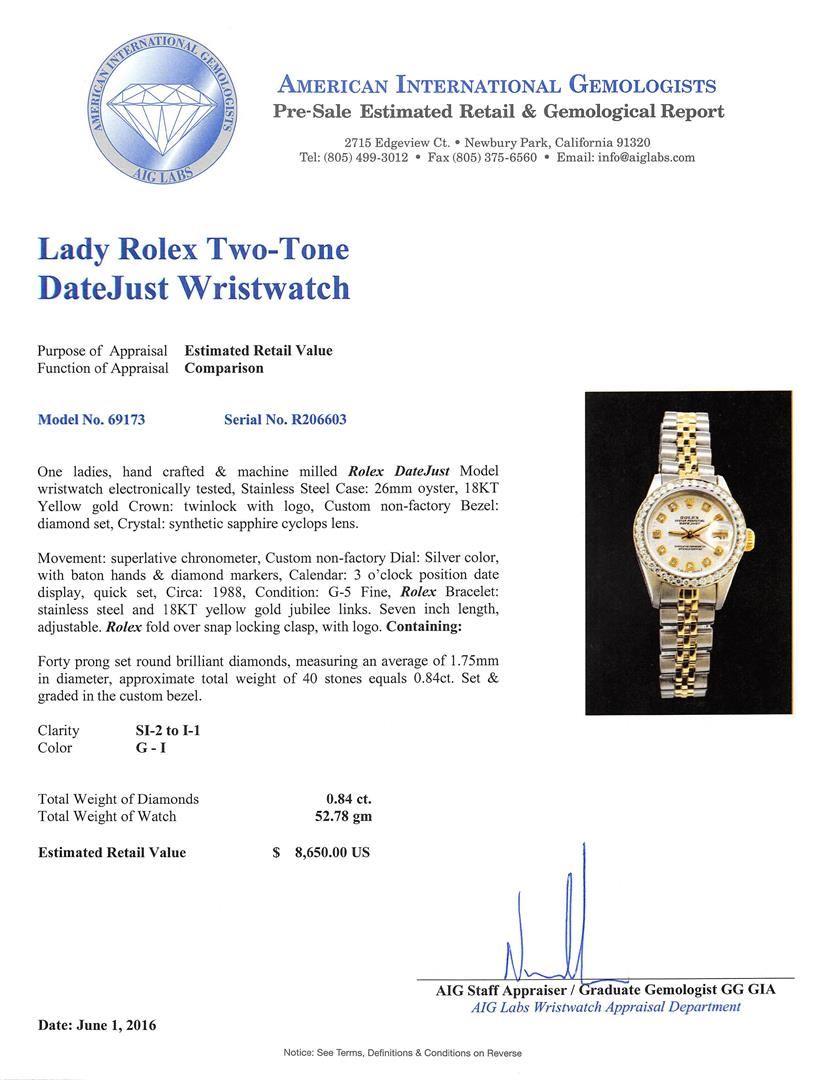One ladies, hand crafted & machine milled Rolex DateJust Model wristwatch electronically tested, Stainless Steel Case: 26mm oyster, 18KT Yellow gold Crown: twinlock with logo, Custom non-factory Bezel: diamond set, Crystal: synthetic sapphire cyclops lens. Movement: superlative chronometer, Custom non-factory Dial: Silver color, with baton hands & diamond markers, Calendar: 3 o'clock position date display, quick set, Circa: 1988, Condition: G-5 Fine, Rolex Bracelet: stainless steel and 18KT yellow gold jubilee links. Seven inch length, adjustable. Rolex fold over snap locking clasp, with logo. Containing: Forty prong set round brilliant diamonds, measuring an average of 1.75mm in diameter, approximate total weight of 40 stones equals 0.84ct. Set & graded in the custom bezel. Clarity: SI-2 to I-1. Color: G - I. Total Weight of Diamonds 0.84ct. Total Weight of Watch 52.78gm. AIG Appraised at $8,650.00.