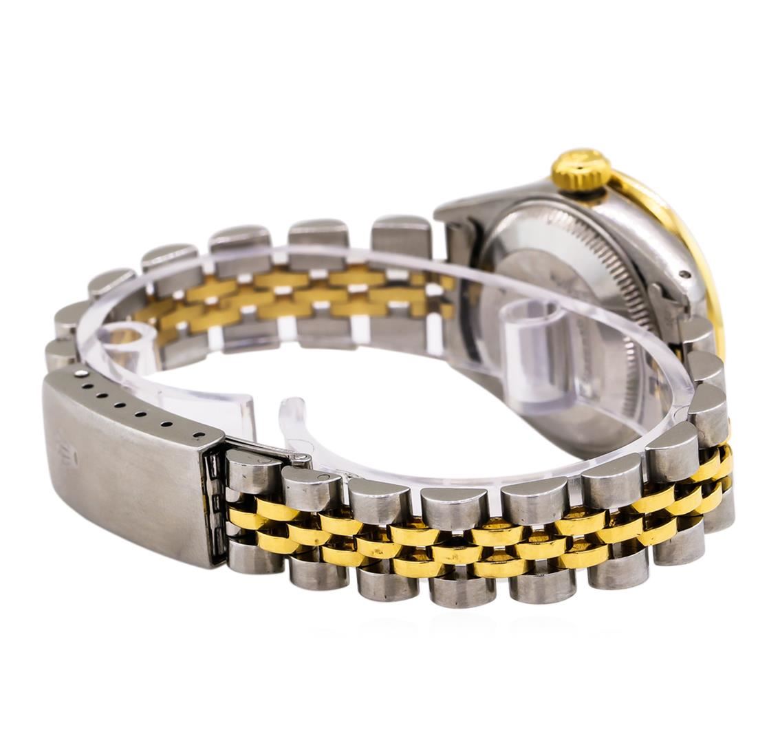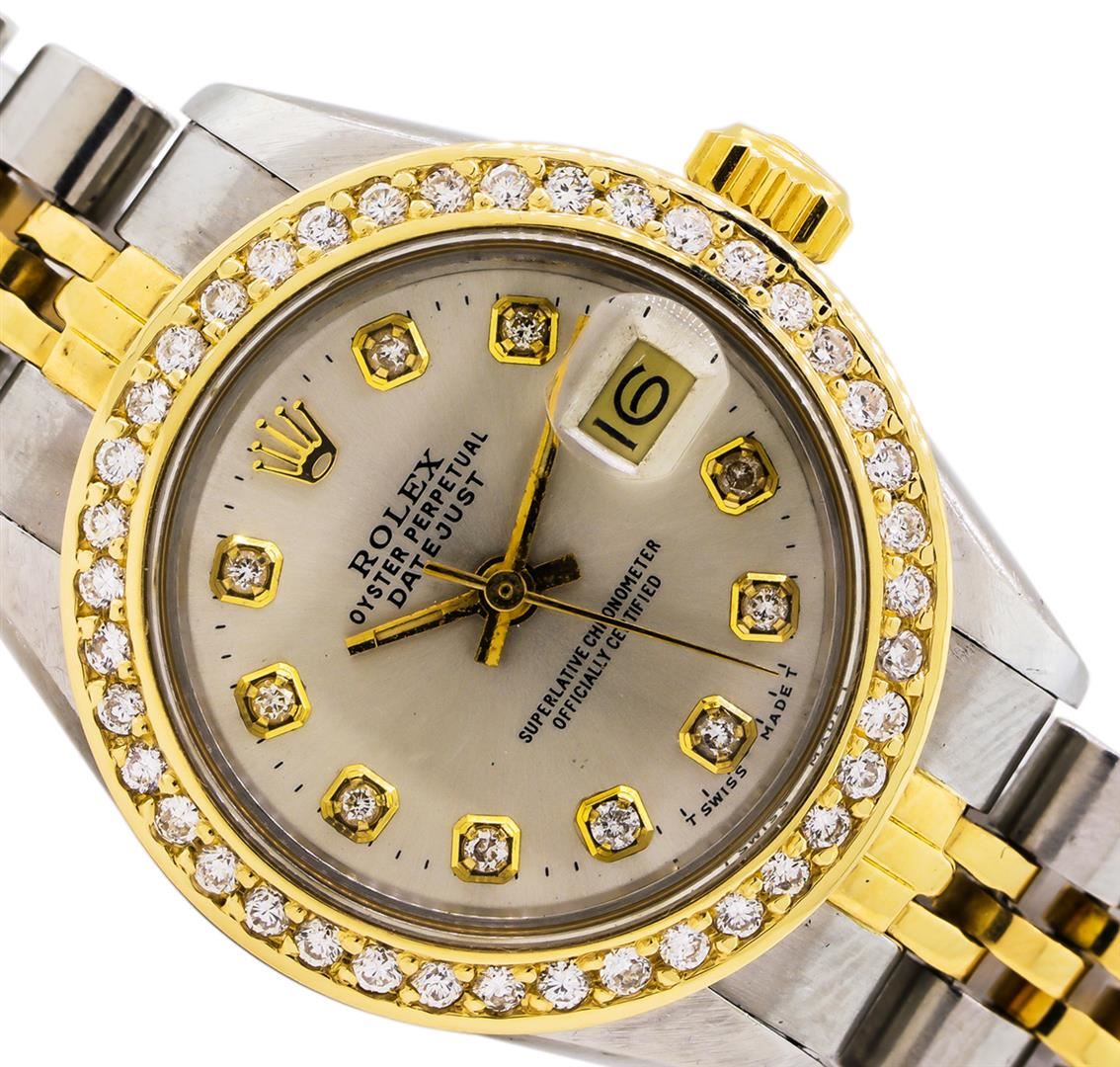 One ladies, hand crafted & machine milled Rolex DateJust Model wristwatch electronically tested, Stainless Steel Case: 26mm oyster, 18KT Yellow gold Crown: twinlock with logo, non-factory Custom Bezel: diamond set, Crystal: acrylic cyclops lens. Movement: superlative chronometer, Rolex signed Dial: Silver color, with baton hands & diamond markers, Calendar: 3 o'clock position date display, Ivory color, non-quick set, Circa: 1979, Condition: G-5 Fine, Rolex Bracelet: stainless steel and 18KT yellow gold jubilee links. Six inch length, adjustable. Rolex Hallmarked clasp, with logo. Containing: Forty prong set round brilliant diamonds, measuring an average of 1.65mm in diameter, approximate total weight of 40 stones equals 0.68ct. Set & graded in the custom bezel. Clarity: VS-1 to SI-1 Average. Color: F - H. Total Weight of Diamonds 0.68ct. Total Weight of Watch 50.93gm. AIG Appraised at $8,050.00.