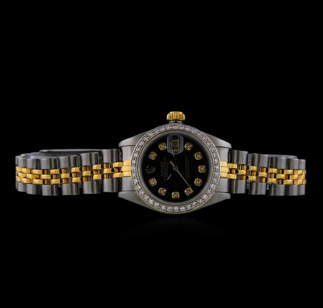 One ladies, hand crafted & machine milled Rolex DateJust Model wristwatch electronically tested, Stainless Steel Case: 26mm oyster, 18KT Yellow gold Crown: twinlock with Rolex logo, non-factory Custom Bezel: diamond set, Crystal: synthetic sapphire cyclops lens. Movement: superlative chronometer, Rolex signed Dial: Black color, with baton hands & diamond markers, Calendar: 3 o'clock position date display, Ivory color, quick set, Circa: 1990, Condition: G-5 Fine, Rolex Bracelet: stainless steel and 18KT yellow gold jubilee links. Six inch length, adjustable. Rolex Hallmarked clasp, with logo. Containing: Forty prong set round brilliant diamonds, measuring an average of 1.60mm in diameter, approximate total weight of 40 stones equals 0.62ct. Set & graded in the custom bezel. Clarity: VS-1 to VS-2 Average. Color: G - I. Total Weight of Diamonds 0.62ct. Total Weight of Watch 50.99gm. AIG Appraised at $8,050.00.