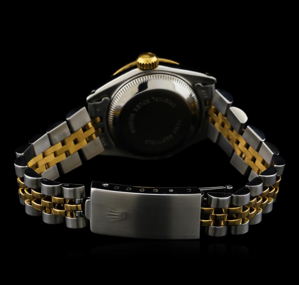 One ladies, hand crafted & machine milled Rolex DateJust Model wristwatch electronically tested, Stainless Steel Case: 26mm oyster, 18KT Yellow gold Crown: twinlock with Rolex logo, non-factory Custom Bezel: diamond set, Crystal: synthetic sapphire cyclops lens. Movement: superlative chronometer, Rolex signed Dial: Black color, with baton hands & diamond markers, Calendar: 3 o'clock position date display, Ivory color, quick set, Circa: 1984, Condition: G-5 Fine, Rolex Bracelet: stainless steel and 18KT yellow gold jubilee links. Six inch length, adjustable. Rolex Hallmarked clasp, with logo. Containing: Forty prong set round brilliant diamonds, measuring an average of 1.65mm in diameter, approximate total weight of 40 stones equals 0.65ct. Set & graded in the custom bezel. Clarity: VS-1 to VS-2 Average. Color: G - H. Total Weight of Diamonds 0.65ct. Total Weight of Watch 52.37gm. AIG Appraised at $8,050.00.