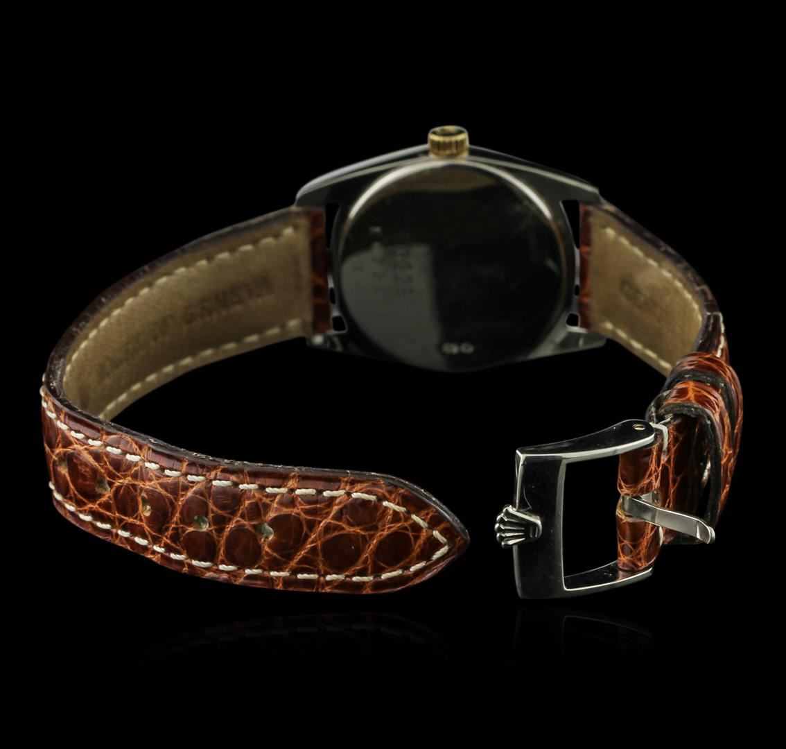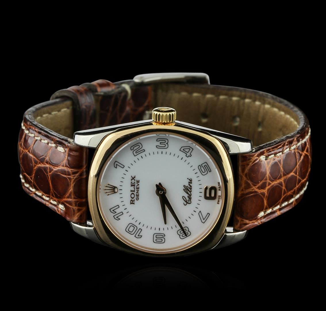 One, ladies Rolex Cellini Danaos wristwatch, electronically tested 18KT rose & white gold, Case: 26mm, Swiss Hallmarked Case Back: engraved with the manufacturers ID numbers, Crown: logo engraved: Bezel: polished, Crystal: synthetic sapphire lens, Movement: quartz, Circa: 2001.White Dial: with pointed hands painted numerals and one raised gold numeral at 6 o'clock, Bracelet: Crocodile saddle stitched brown leather strap, Condition: G-5 fine. Six and three quarter inch length, adjustable. Swiss Hallmarked Rolex 18KT white gold buckle, with logo. Total Weight of Watch 32.85gm. AIG Appraised at $5,300.00.
