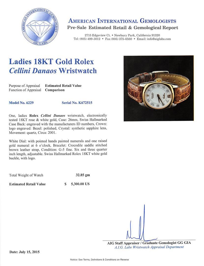 One, ladies Rolex Cellini Danaos wristwatch, electronically tested 18KT rose & white gold, Case: 26mm, Swiss Hallmarked Case Back: engraved with the manufacturers ID numbers, Crown: logo engraved: Bezel: polished, Crystal: synthetic sapphire lens, Movement: quartz, Circa: 2001.White Dial: with pointed hands painted numerals and one raised gold numeral at 6 o'clock, Bracelet: Crocodile saddle stitched brown leather strap, Condition: G-5 fine. Six and three quarter inch length, adjustable. Swiss Hallmarked Rolex 18KT white gold buckle, with logo. Total Weight of Watch 32.85gm. AIG Appraised at $5,300.00.