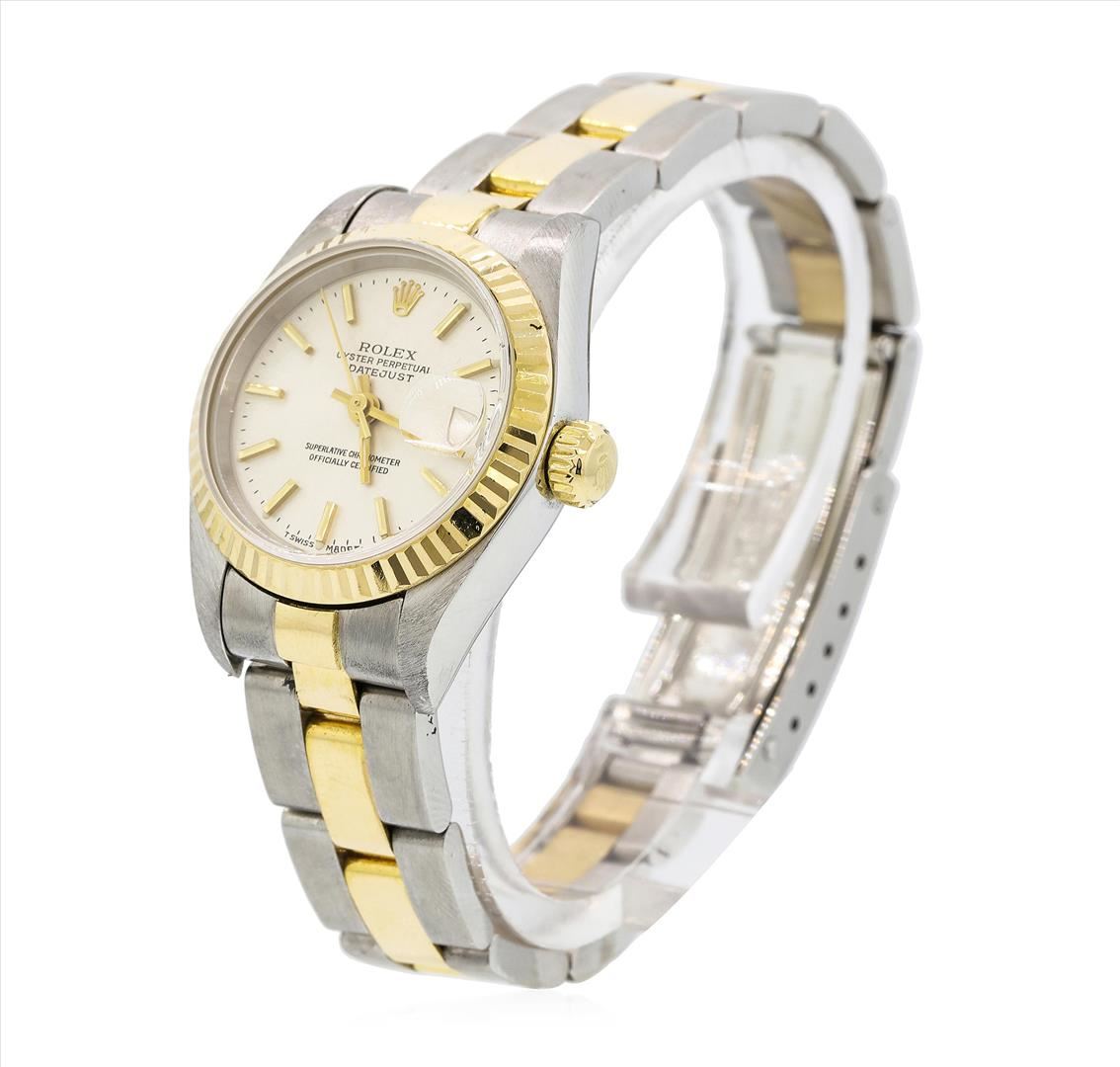 One ladies, hand crafted & machine milled Rolex DateJust Model wristwatch electro-chemically tested. Stainless Steel Rolex Oyster Case: 26mm, Rolex Signature 18KT Yellow gold Crown: twinlock with high relief logo, 18KT yellow gold Bezel: fluted, Crystal: synthetic sapphire cyclops lens. Circa: 1997, Condition: G-6 Extra Fine. Movement: superlative chronometer automatic, Rolex signed Dial: Light Silver color, with baton hands, and raised indices, Calendar: 3 o'clock position date display, quick set. Rolex Bracelet: stainless steel and 18KT Yellow gold oyster links. Six and one half inch length, adjustable. Swiss & Rolex Hallmarked clasp, with high relief logo. Total Weight of Watch 55.86gm. AIG Appraised.