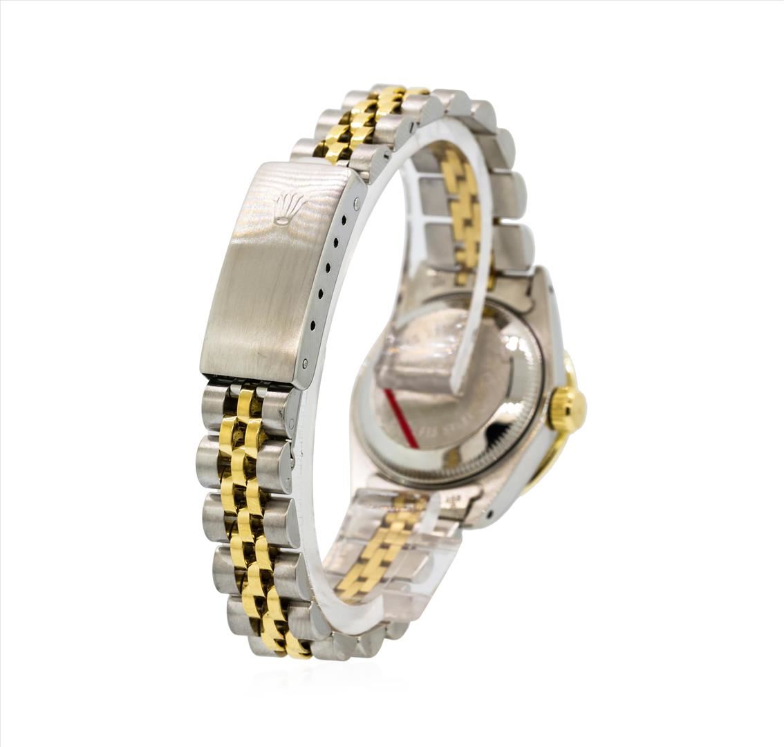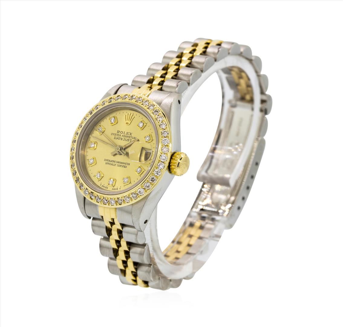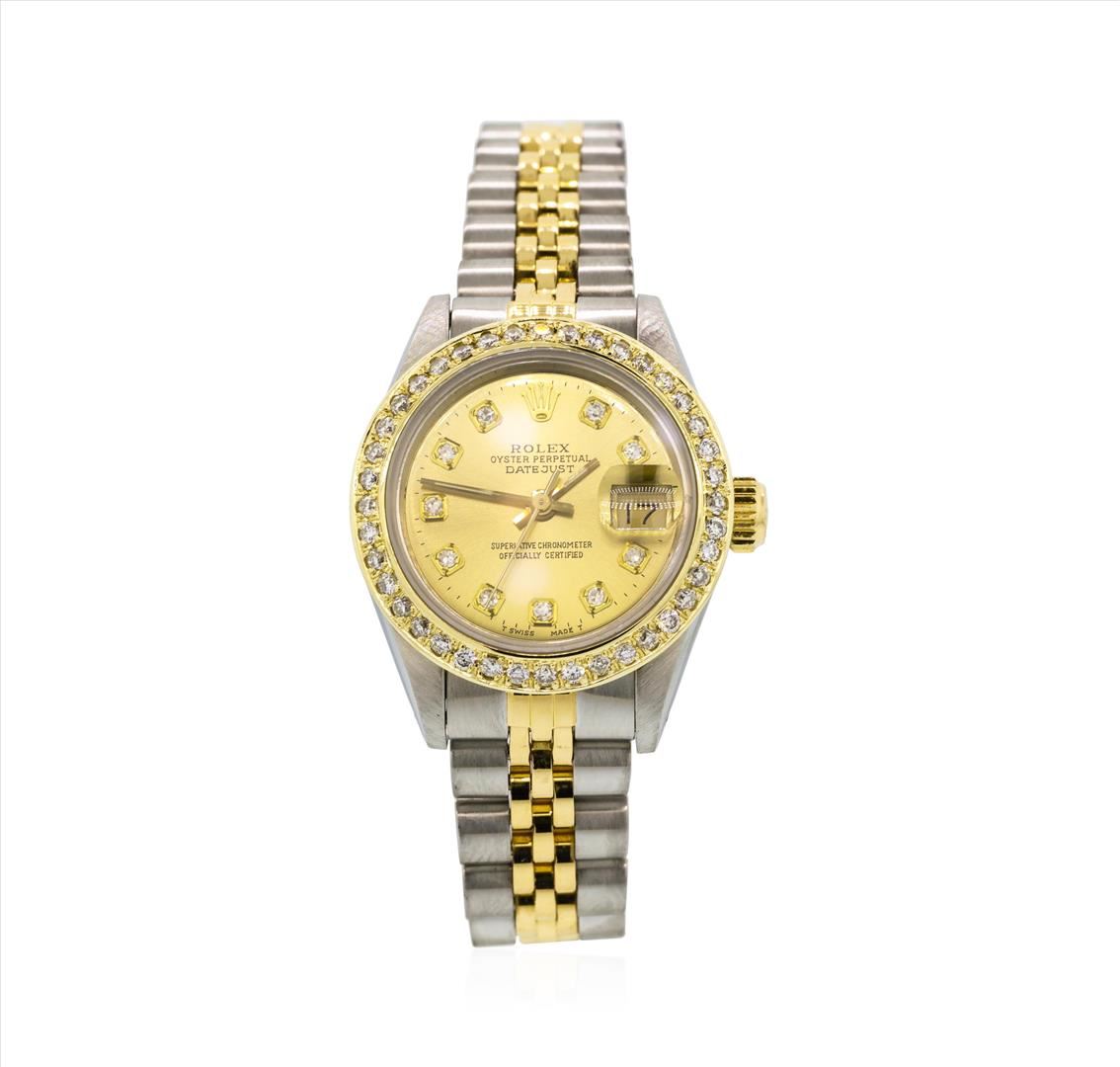 One ladies, hand crafted & machine milled Rolex DateJust Model wristwatch electro-chemically tested. Stainless Steel Case: 26mm oyster, 18KT Yellow gold Rolex Signature Crown: twin lock with high relief logo, Custom Bezel: diamond set, Custom Crystal: synthetic sapphire cyclops lens, Circa 1990. Movement: superlative chronometer, Rolex signed Dial: Champagne color, with baton hands & diamond markers, Calendar: 3 o'clock position date display, quick set, Condition: G-5 Fine, Rolex Bracelet: stainless steel and 18KT yellow gold jubilee links. Six and one half inch length, adjustable. Rolex Hallmarked clasp, with logo. Containing: Forty prong set round brilliant cut diamonds, measuring 1.70 - 1.70 x 1.02mm (depth est.) approximate total weight of 40 Stones = 0.72ct. Graded in the setting. Clarity: VVS-2 to VS-2. Color: G - I Ten prong set single cut diamonds, measuring 1.30 - 1.30 x 0.78mm (depth est.) approximate total weight of 10 Stones = 0.08ct. Graded in the setting. Clarity: VS-2 to SI-2. Color: F - H. Total Weight of Diamonds 0.80ct. Total Weight of Watch 53.86gm. AIG Appraised.