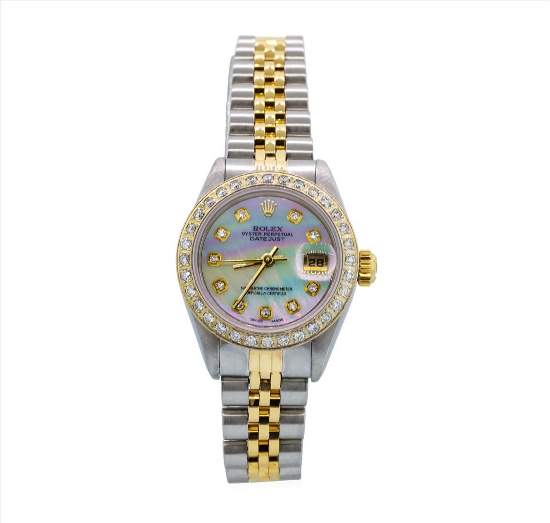 One ladies, hand crafted & machine milled Rolex DateJust Model wristwatch electro-chemically tested. Stainless Steel Case: 26mm oyster, 18KT Yellow gold Rolex Signature Crown: twinlock with high relief logo, Custom Bezel: diamond set, Custom Crystal: synthetic sapphire cyclops lens, Circa 1996. Movement: superlative chronometer, Custom Dial: mother of pearl, with baton hands & diamond markers, Calendar: 3 o'clock position date display, quick set, Condition: G-5 Fine, Rolex Bracelet: stainless steel and 18KT yellow gold jubilee links. Seven and one quarter length, adjustable. Rolex Hallmarked clasp, with logo. Containing: Thirty-Two prong set round brilliant cut diamonds, measuring 1.70 - 1.70 x 1.02mm (depth est.) approximate total weight of 32 Stones = 0.58ct. Graded in the setting. Clarity: SI-1 to SI-2. Color: G - I Ten prong set single cut diamonds, measuring 1.30 - 1.30 x 0.78mm (depth est.) approximate total weight of 10 Stones = 0.08ct. Graded in the setting. Clarity: VS-1 to SI-1. Color: G - H. Total Weight of Diamonds 0.66ct. Total Weight of Watch56.18gm. Containing: Thirty-Two prong set round brilliant cut diamonds, measuring 1.70 - 1.70 x 1.02mm (depth est.) approximate total weight of 32 Stones = 0.58ct. Graded in the setting. Clarity: SI-1 to SI-2. Color: G - H Ten prong set single cut diamonds, measuring 1.30 - 1.30 x 0.78mm (depth est.) approximate total weight of 10 Stones = 0.08ct. Graded in the setting. Clarity: VS-1 to SI-1. Color: G - H. Total Weight of Diamonds 0.66ct. AIG Appraised.
