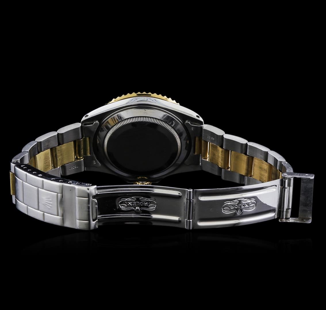 One gents, hand crafted & machine milled Rolex two tone Submariner wristwatch electronically tested, stainless steel Case: 40mm oyster, Water Resistant: 300 meters / 1000 feet, 18KT yellow gold Crown: twin lock, set within protective shoulders, Rotating 18KT yellow gold Bezel: Blue disc, bi-directional, sixty minute time lapse, Crystal: synthetic sapphire cyclops lens. Movement: superlative chronometer, Rolex signed Dial: Silver Serti, with pointed hands and sapphire & diamond markers, Circa: 1989, Calendar: quick set, Rolex Bracelet: two tone stainless steel & 18KT yellow gold oyster link, Oyster flip lock clasp with divers extension, Condition: G-6 Extra Fine. Seven and one half inch length, adjustable. Total Weight of Watch 136.35gm. AIG Appraised at $12,880.00.
